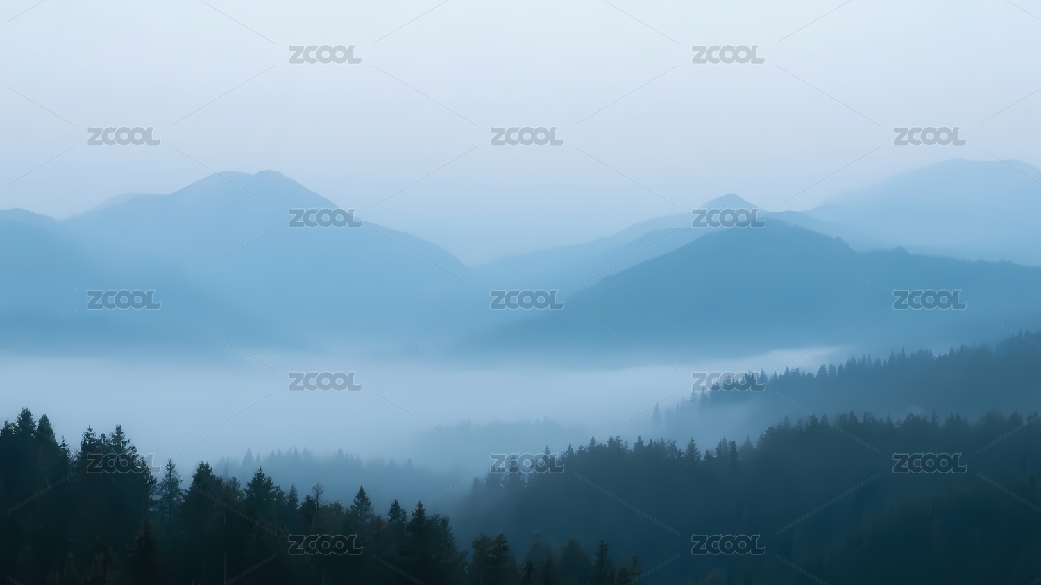 山峦薄雾宁静蓝色景象