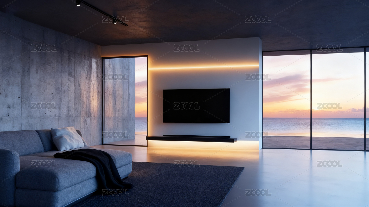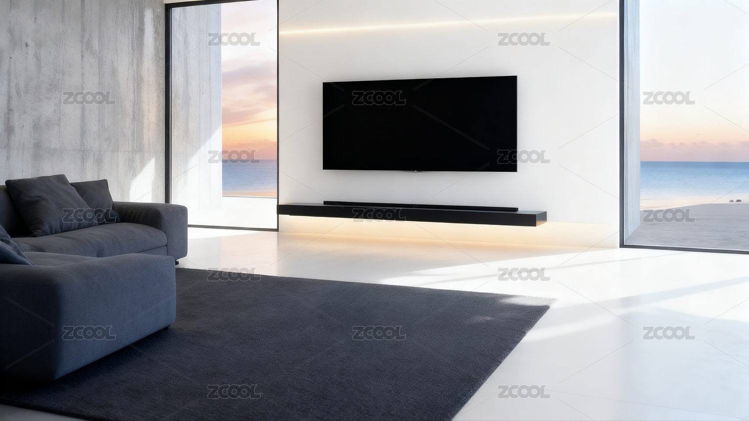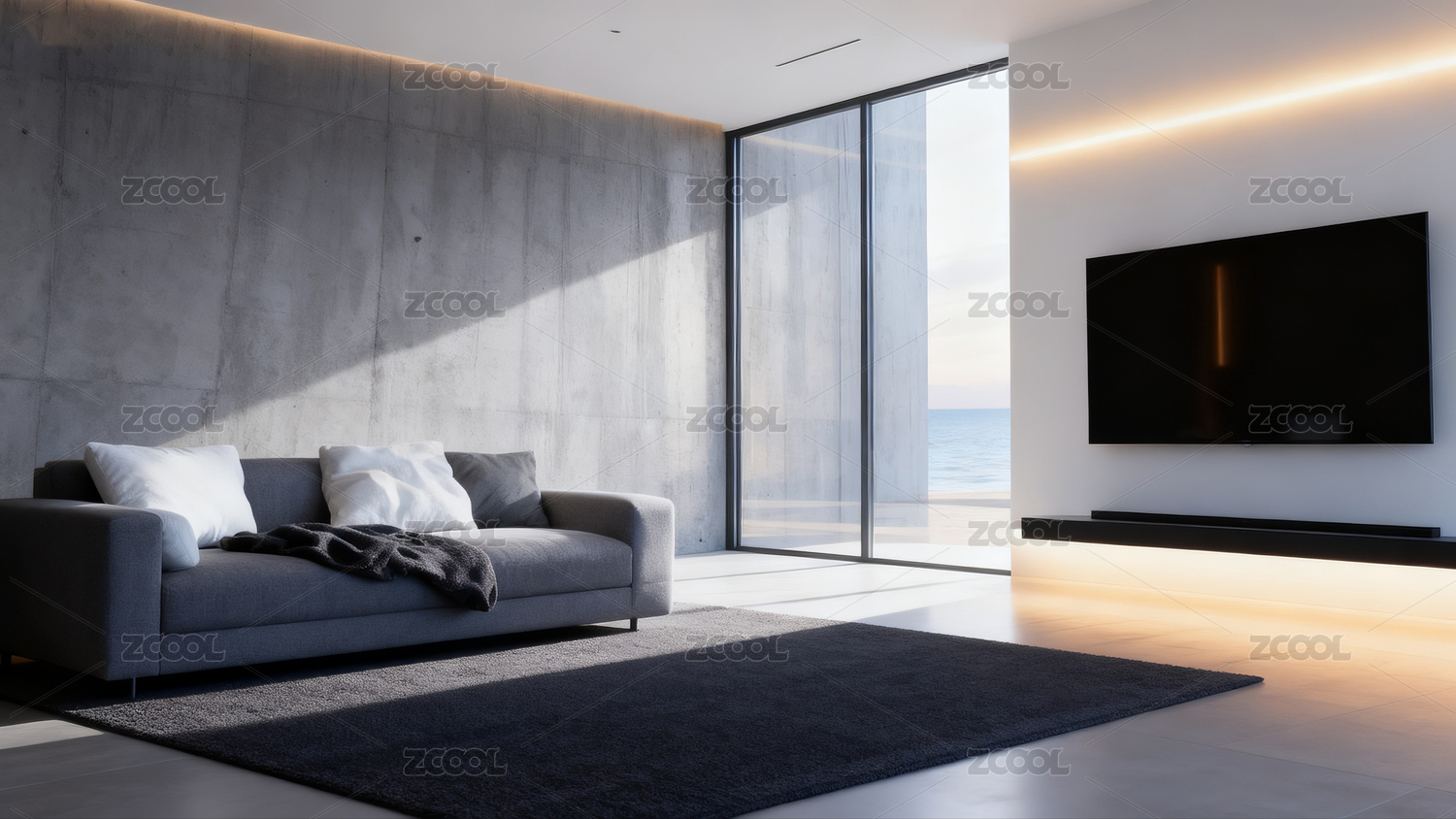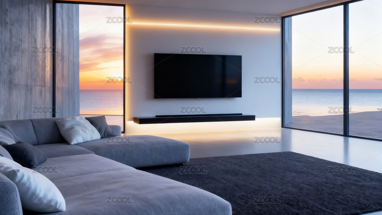 现代,室内,沙发,落地窗,电商,海景,灰色,白色,简约,客厅