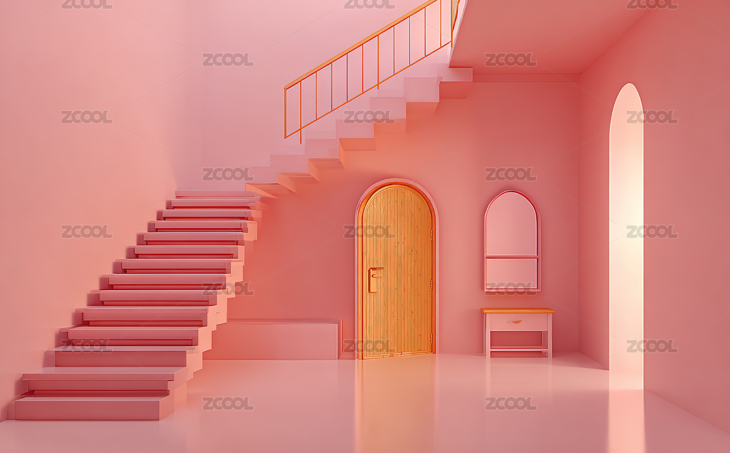 粉色拱门与阶梯的现代空间
