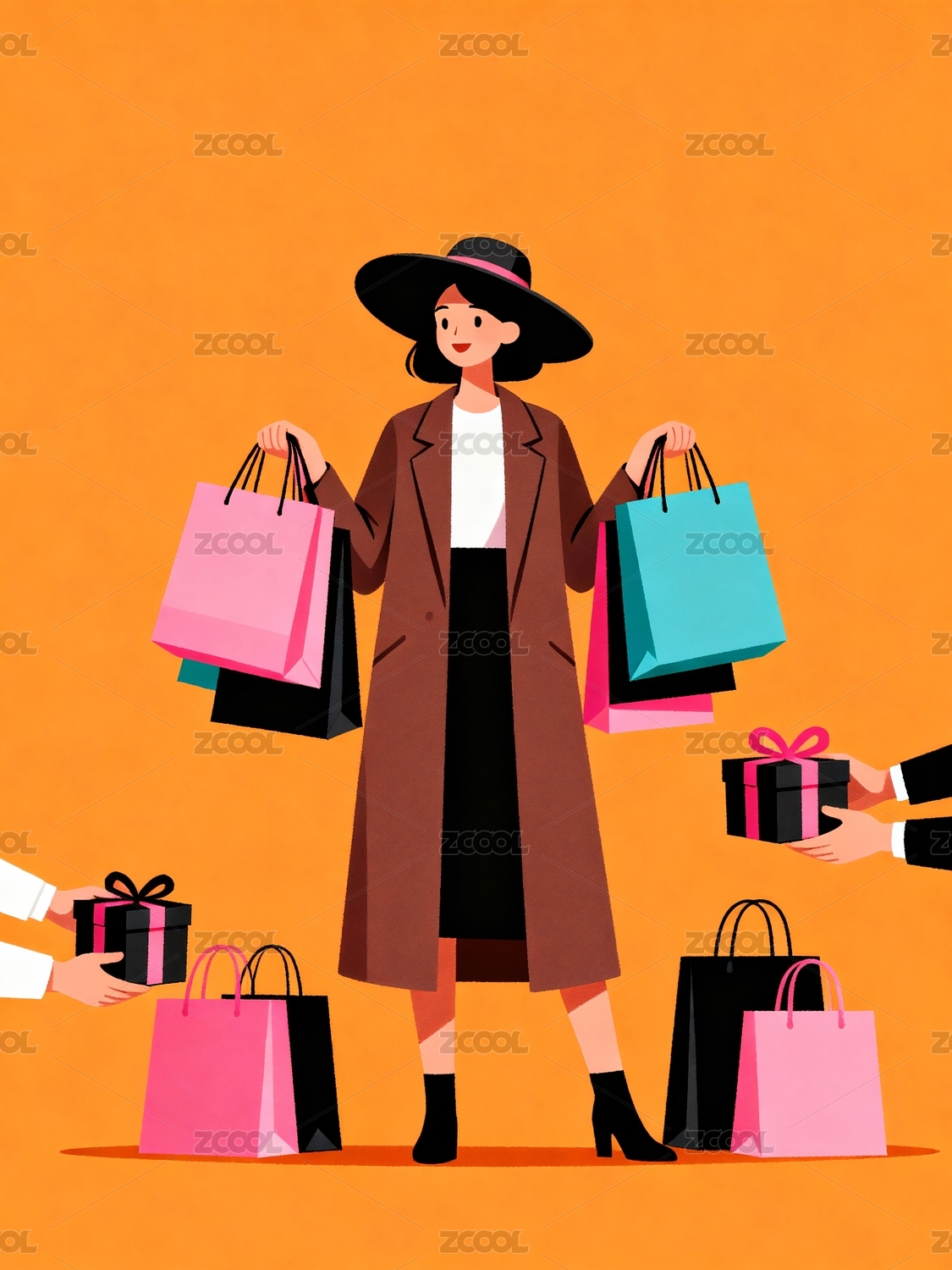外套,白色,手提,购物,裙子,时尚,站立,黑色,纸袋,礼物