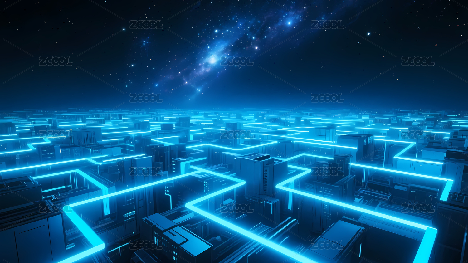 蓝色霓虹构成的复杂迷宫