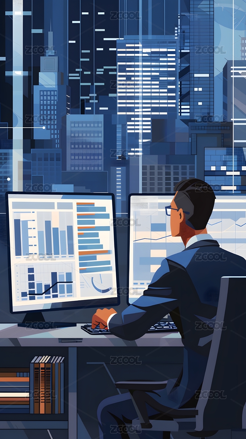 深夜坐在飘窗前的办公桌边 使用电脑办公聊天的加班的白领矢量海报插画背景