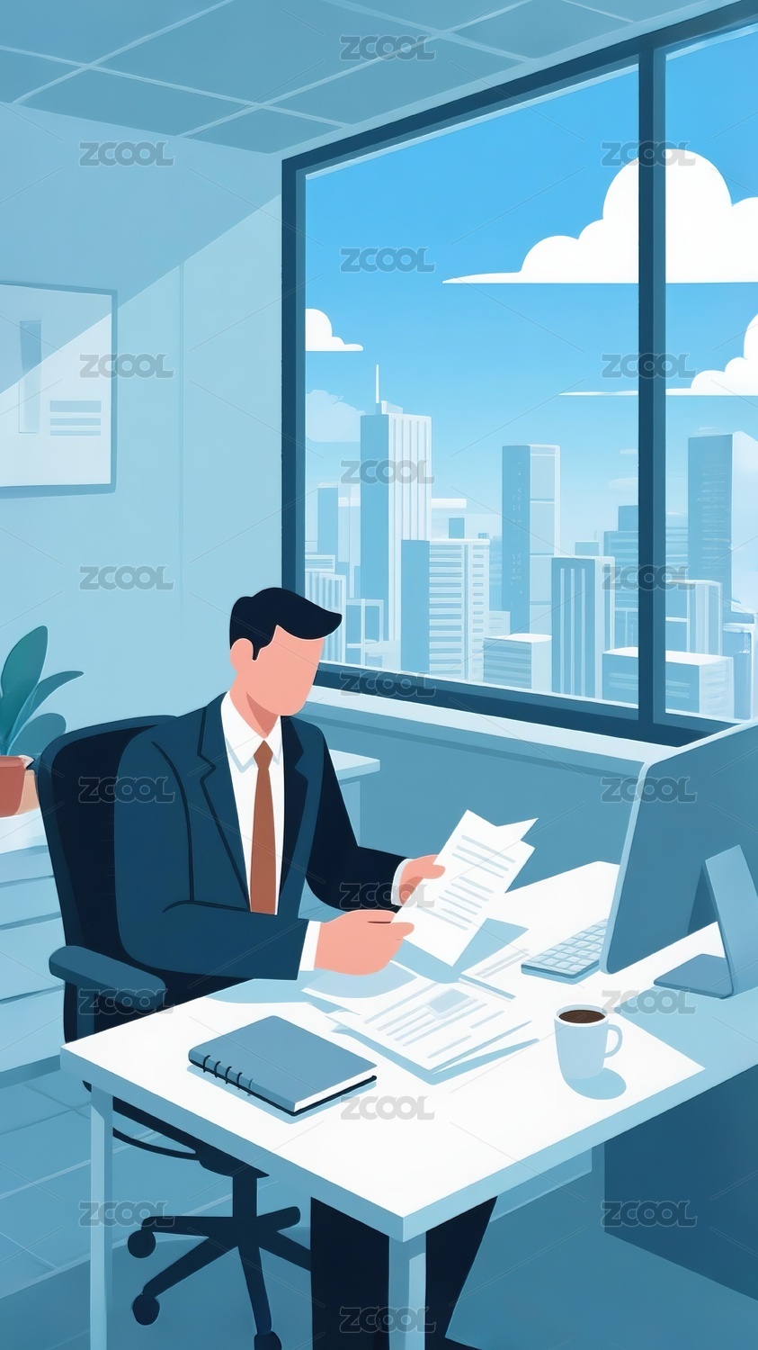 坐在有飘窗的房间的办公桌前 使用电脑办公聊天的穿着休闲服装的男人矢量海报插画背景