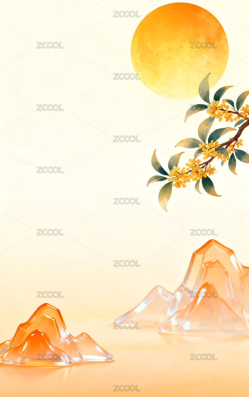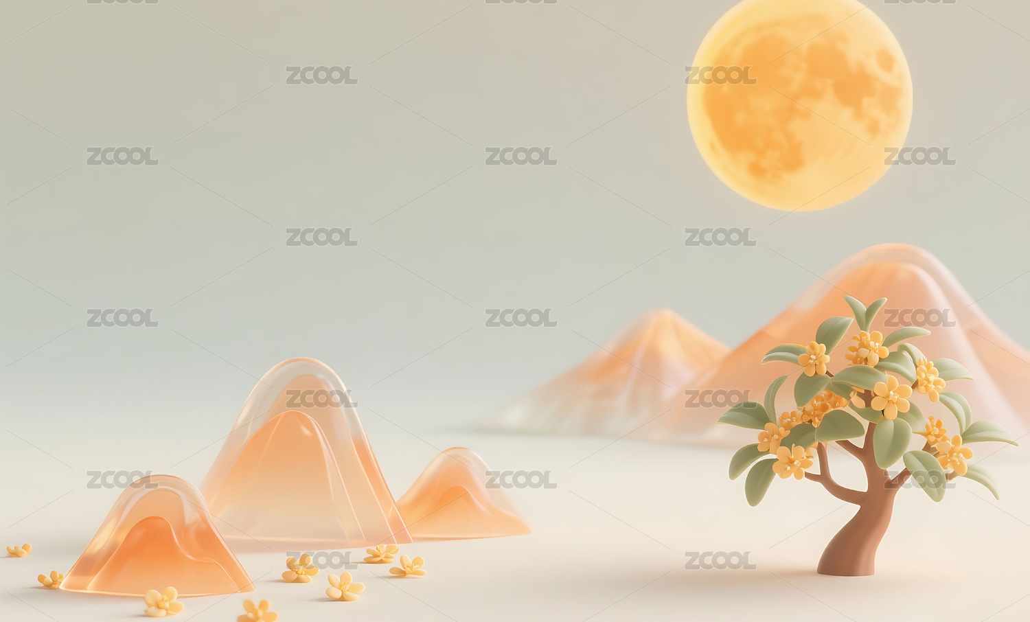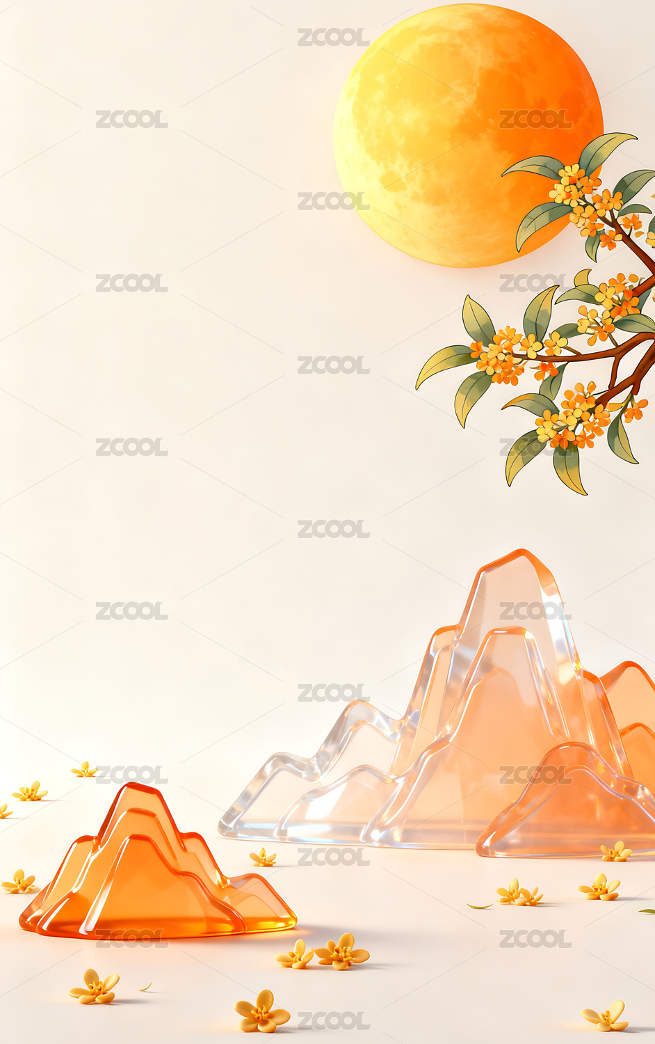 中秋节,3D,玻璃质感,山脉,山峰,月亮,桂花,桂花树,背景,海报