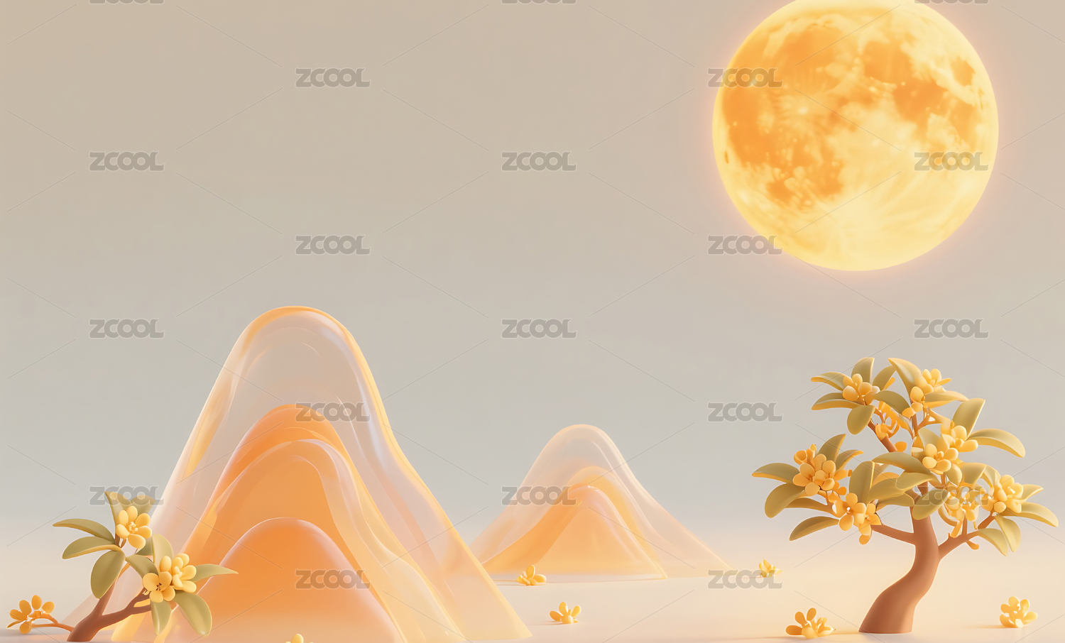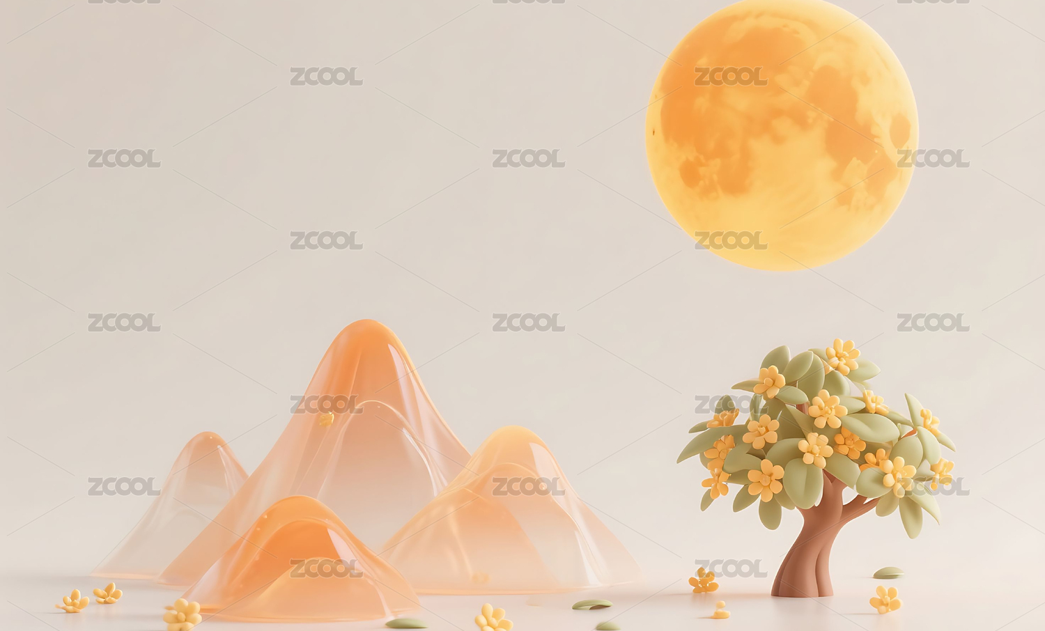 中秋节3D玻璃质感山峰月亮桂花树背景