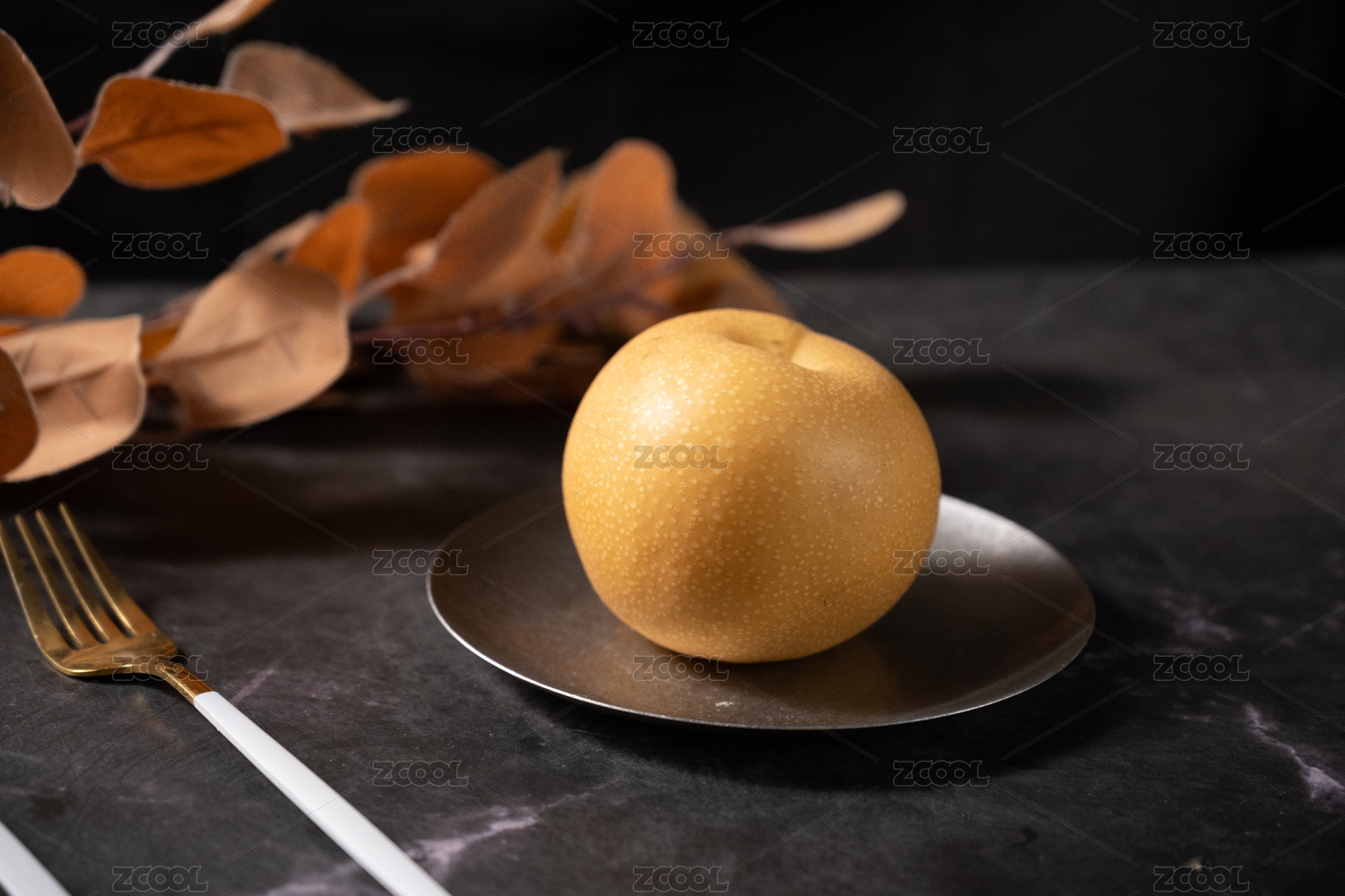 桌面上的盘子里的美味可口的新鲜秋梨