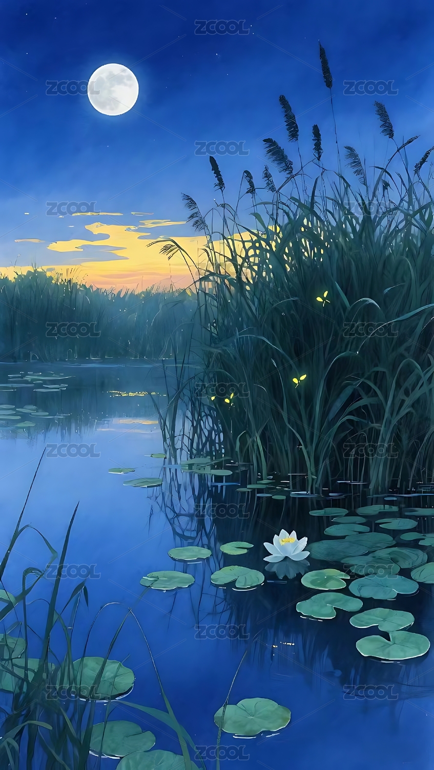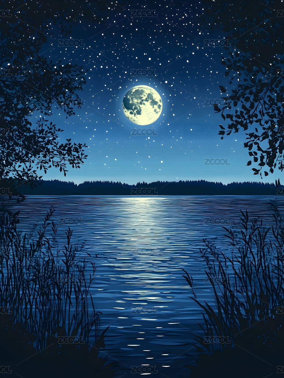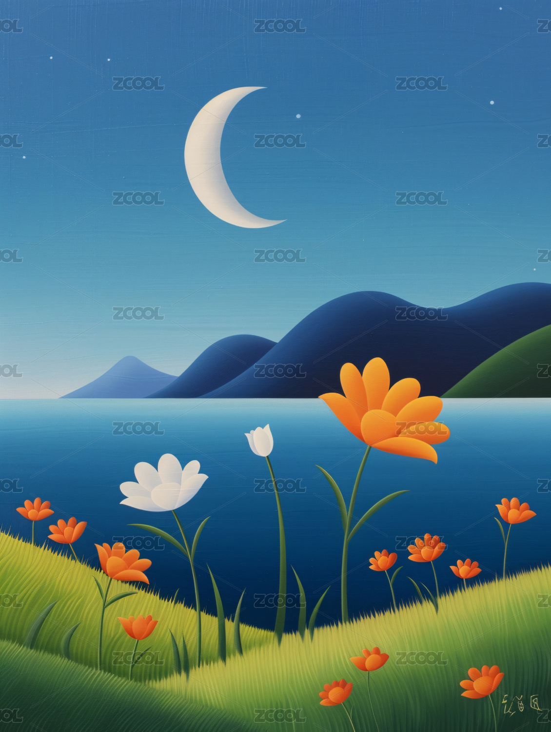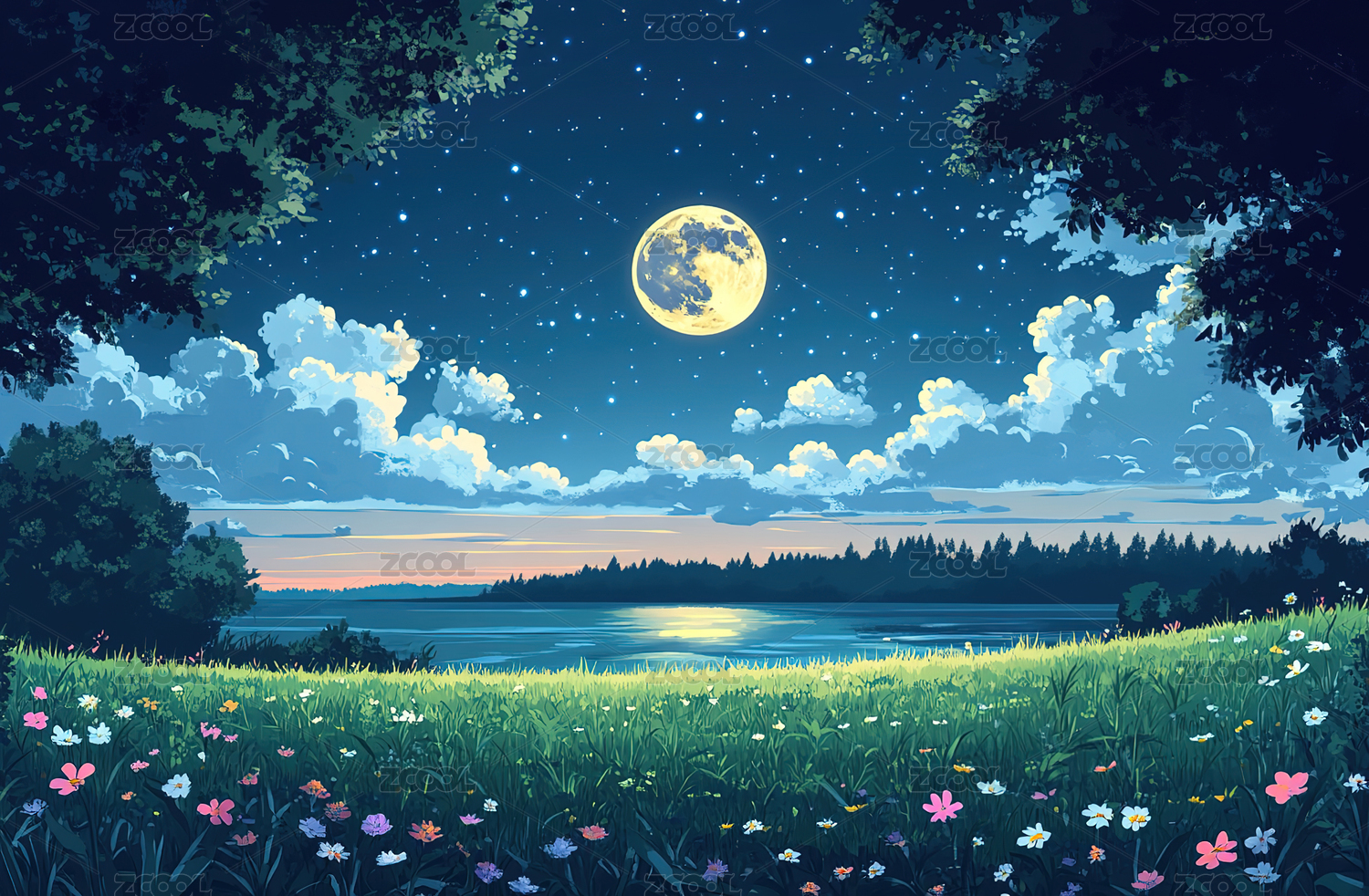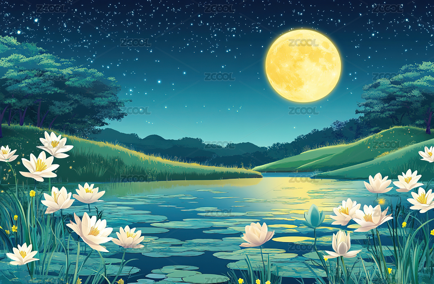 山水,月夜,河流,花朵,风景,插画,宁静,自然,青山,明月
