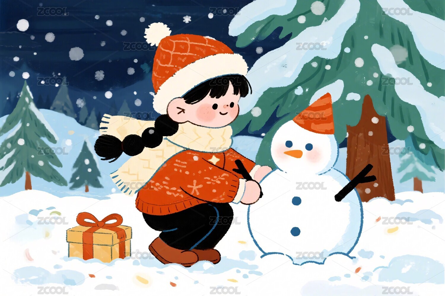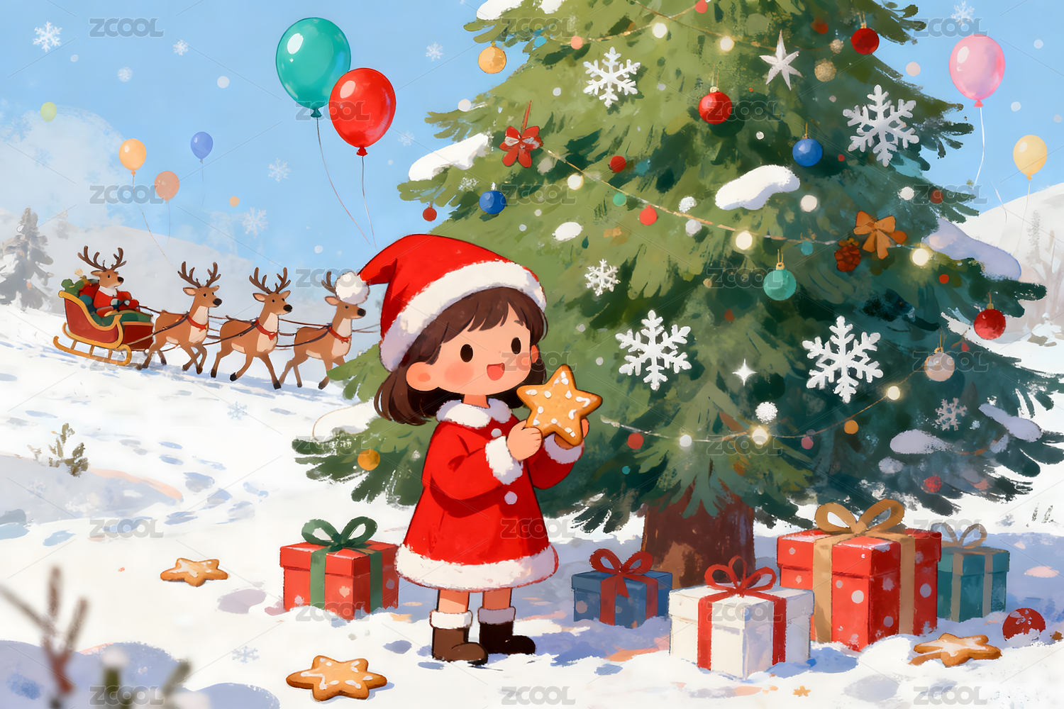圣诞树,小孩,雪景,礼物,雪花,树木,圣诞帽,红色外套,插画,矢量