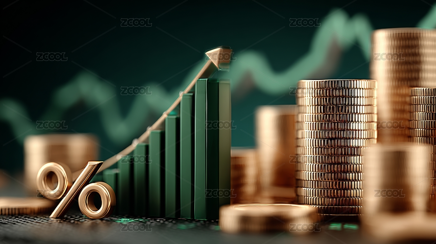 金色硬币堆叠与上升箭头象征经济增长