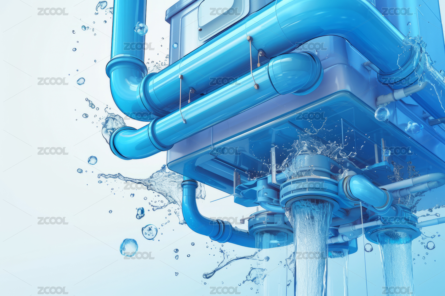 蓝色管道的水流 机械设备的水泄漏
