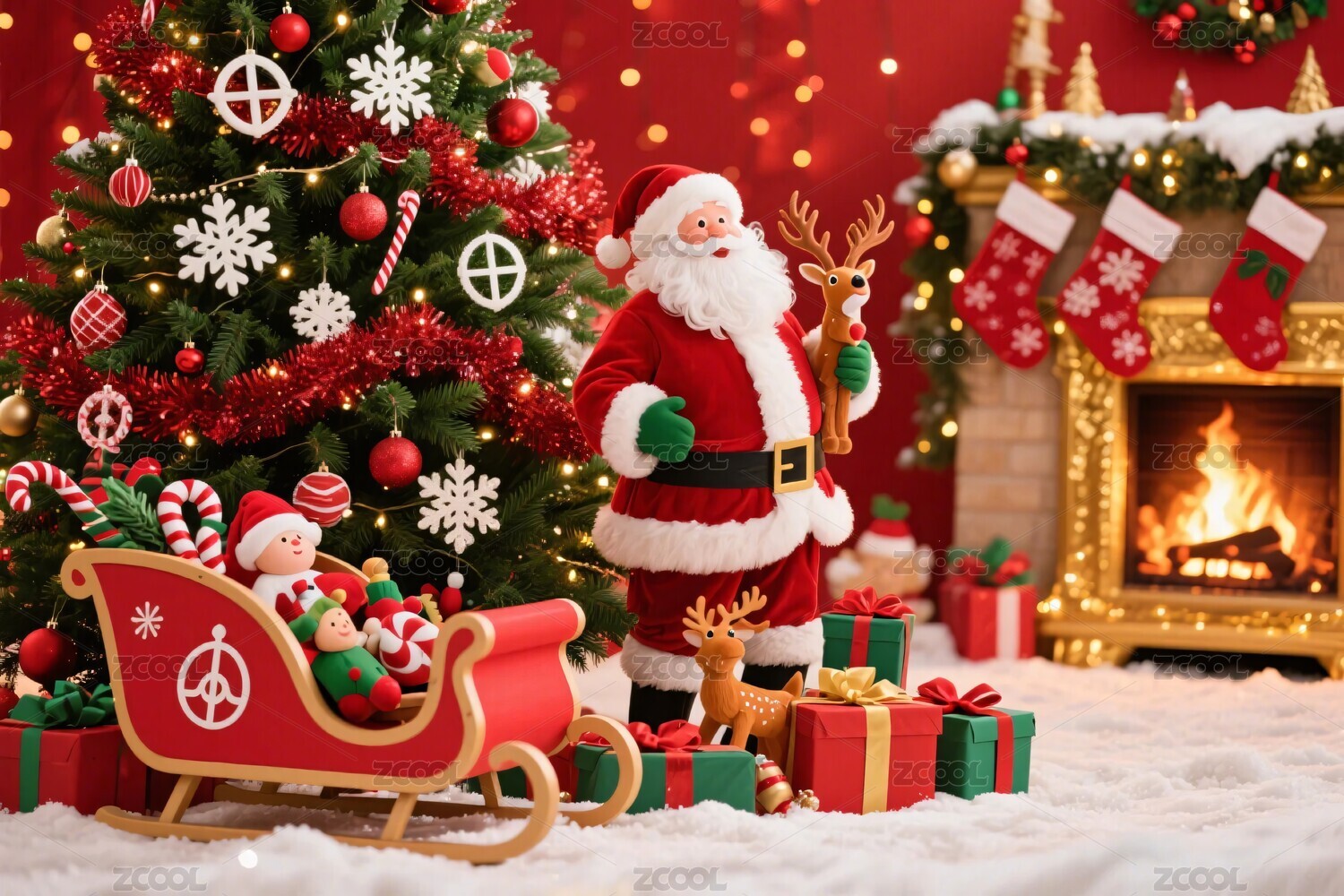 圣诞树,圣诞老人,雪橇,礼物,姜饼人,壁炉,雪花,雪景,冬日,插画