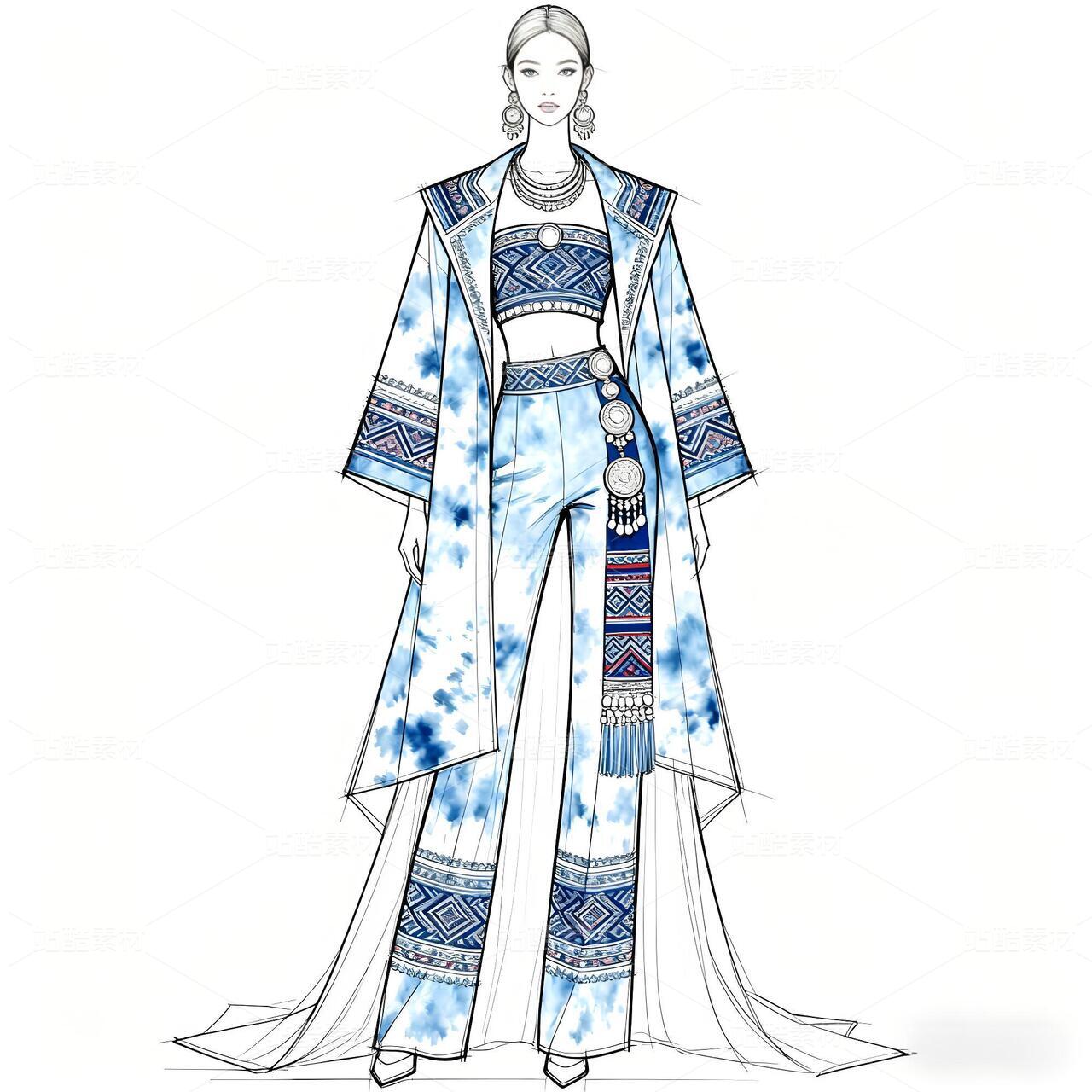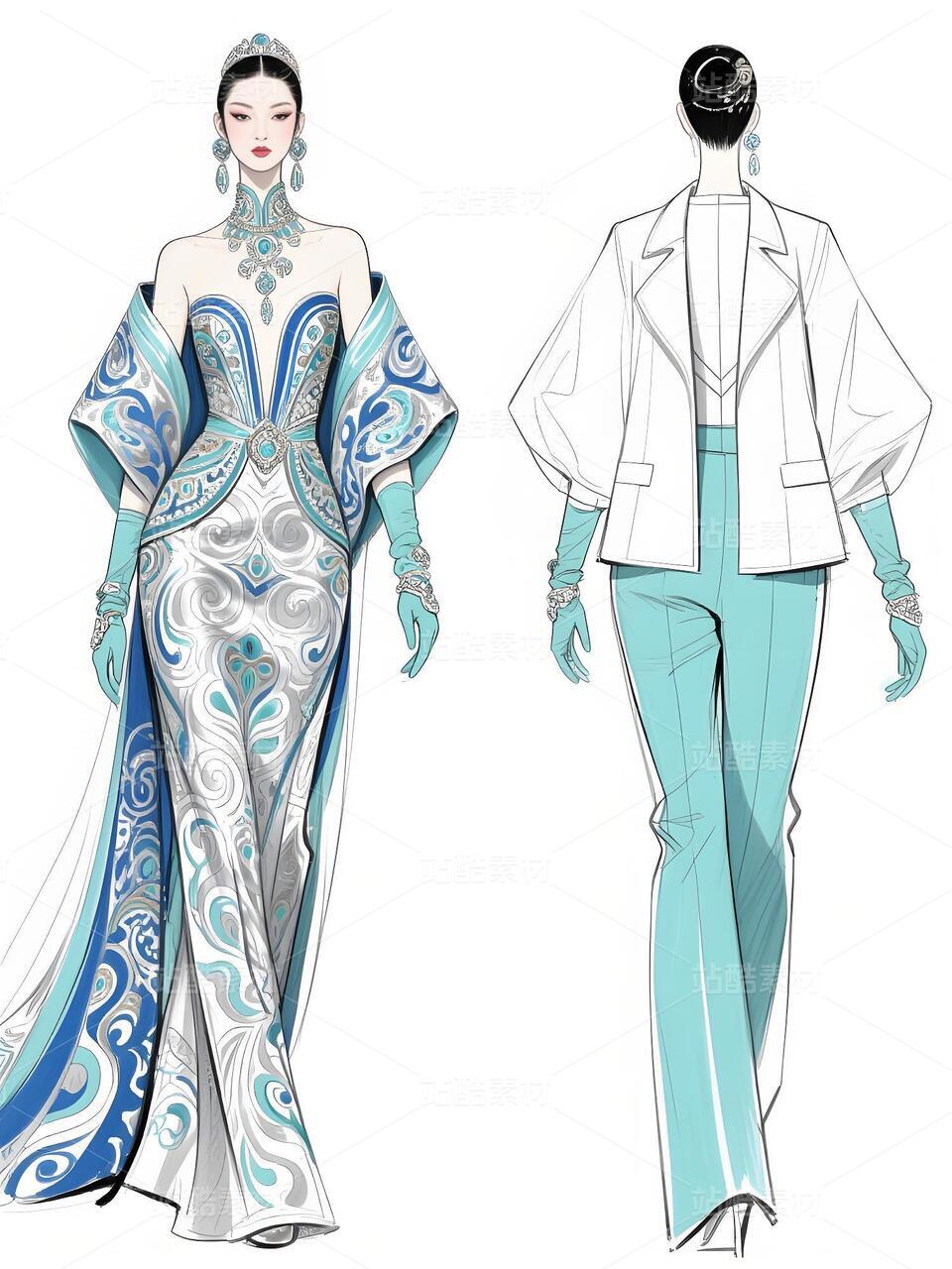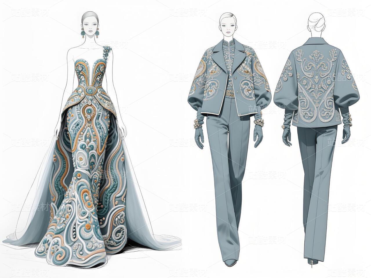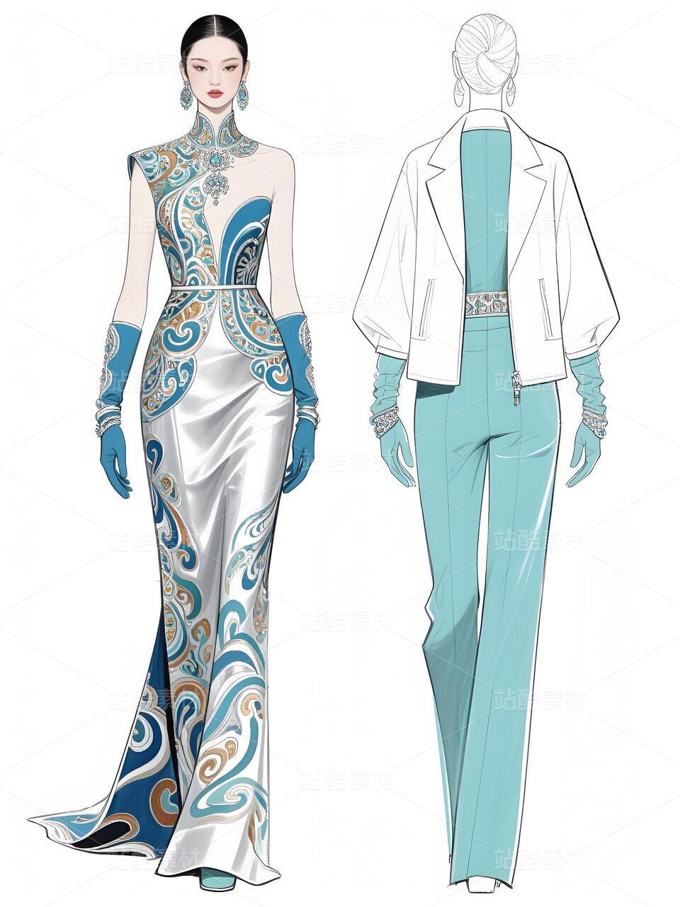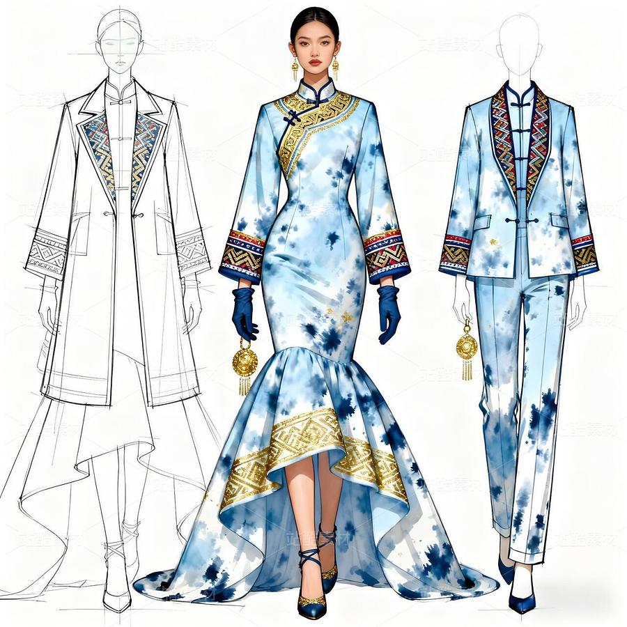 本次设计的“碧澜云锦”礼服,是一场传统非遗与当代时尚的对话。礼服以清雅的浅蓝扎染为底色,如漓江春水,晕染出灵动气韵。核心在于将壮锦这一国家级非遗的经典纹样——如太阳纹、蟒龙纹、几何回纹——进行解构再造,以精致刺绣与立体提花工艺,点缀于西装式外套的肩部、裤装侧缝及手套之上,打破传统民族服饰的固有廓形。