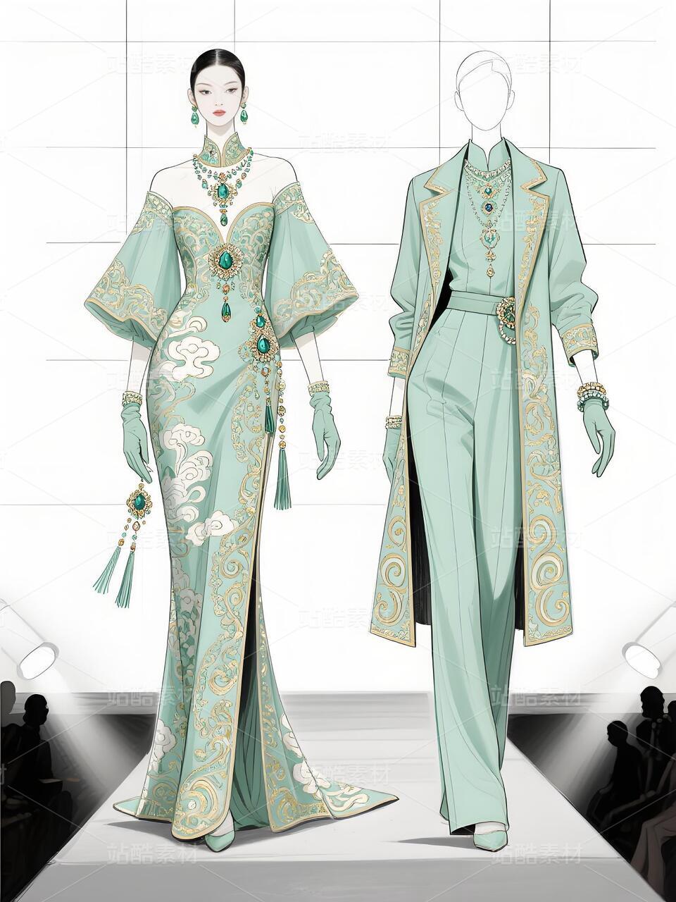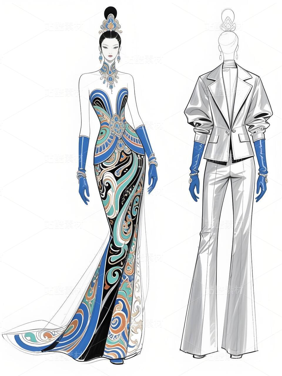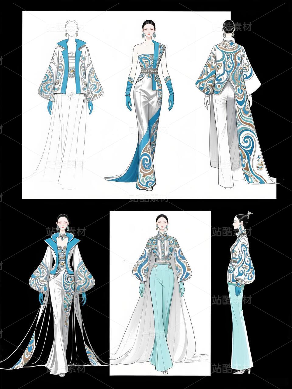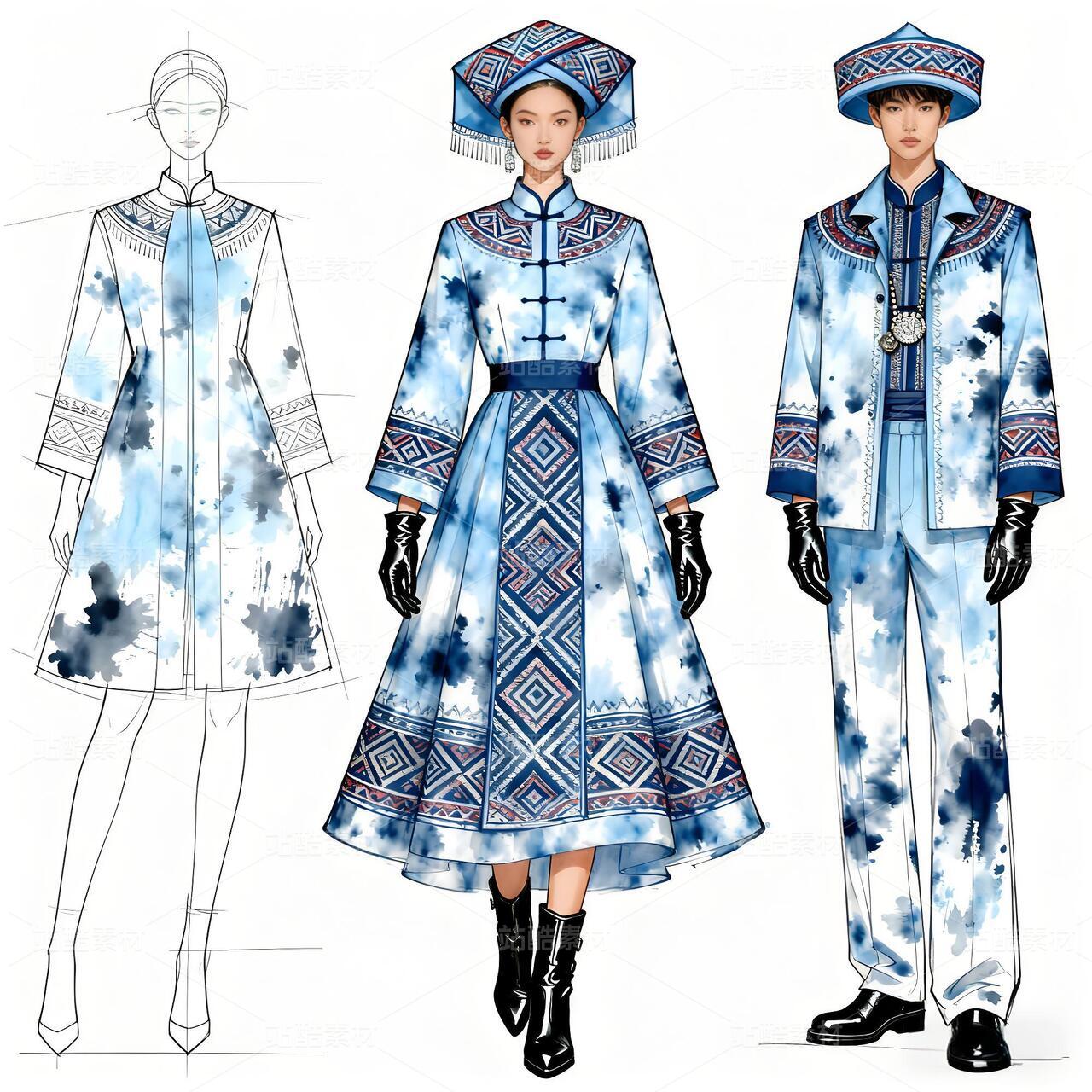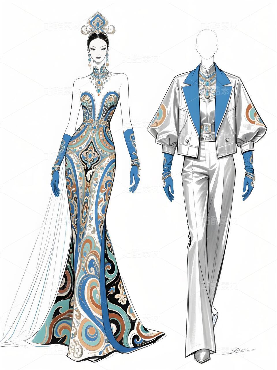 本次设计的“碧澜云锦”礼服,是一场传统非遗与当代时尚的对话。礼服以清雅的浅蓝扎染为底色,如漓江春水,晕染出灵动气韵。核心在于将壮锦这一国家级非遗的经典纹样——如太阳纹、蟒龙纹、几何回纹——进行解构再造,以精致刺绣与立体提花工艺,点缀于西装式外套的肩部、裤装侧缝及手套之上,打破传统民族服饰的固有廓形。