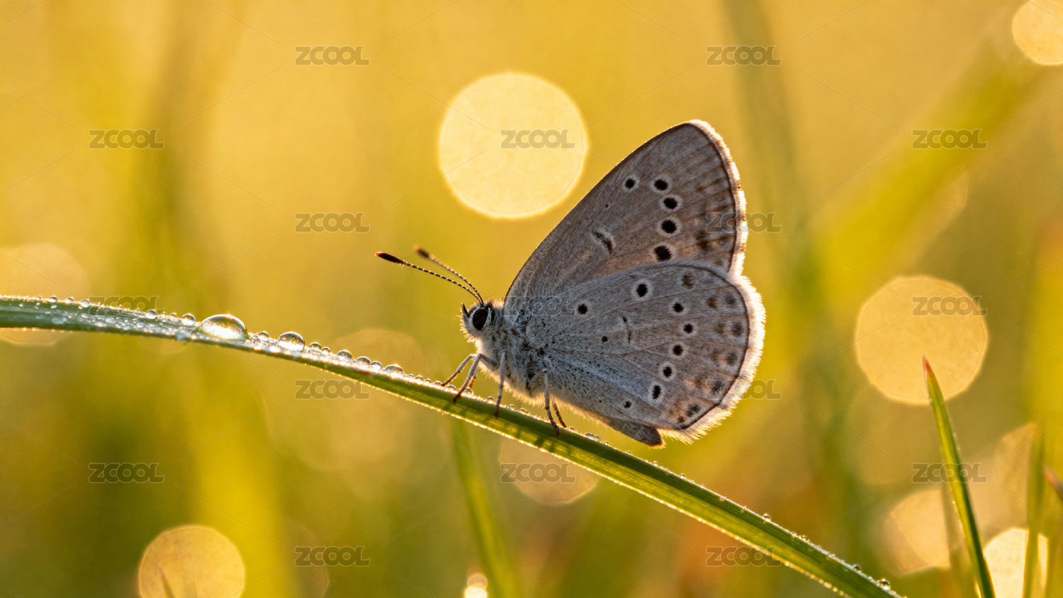 草地上杂乱的叶子上停着一只逆光的小灰蝶
