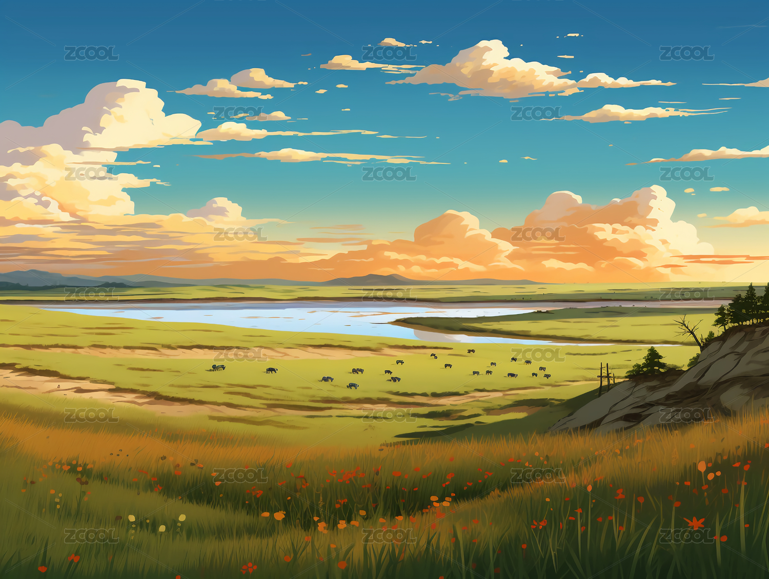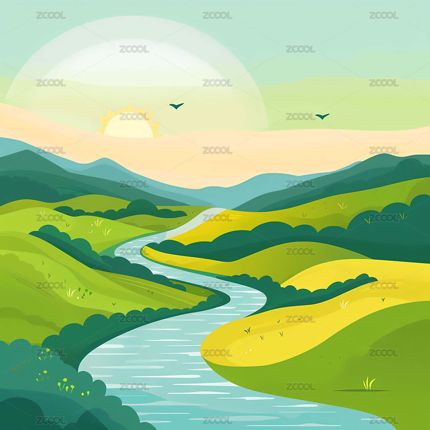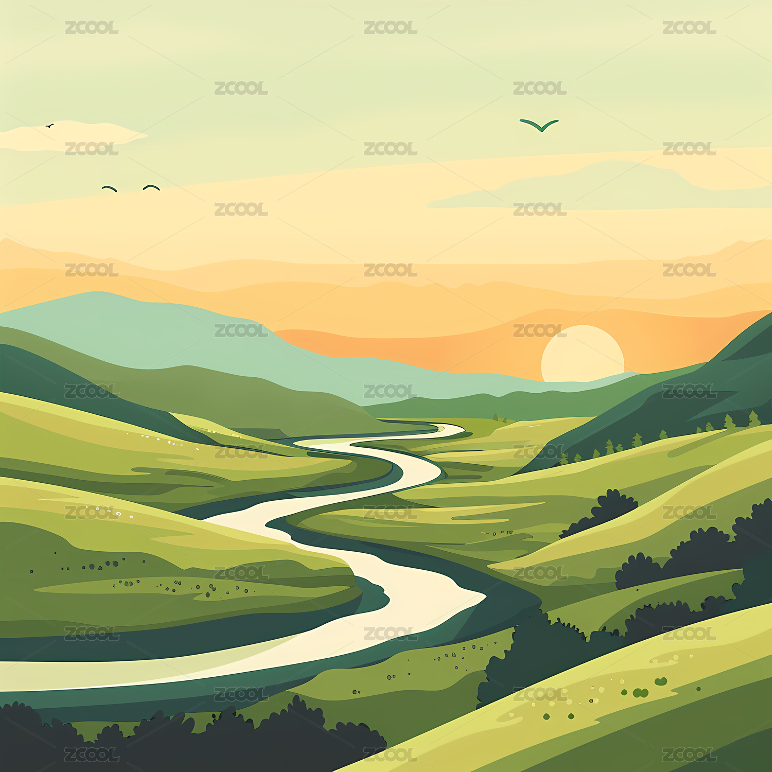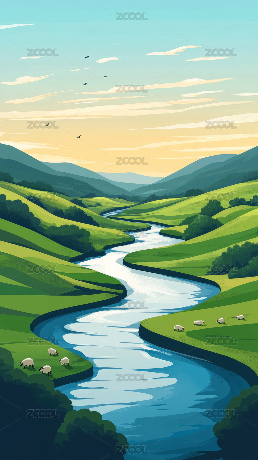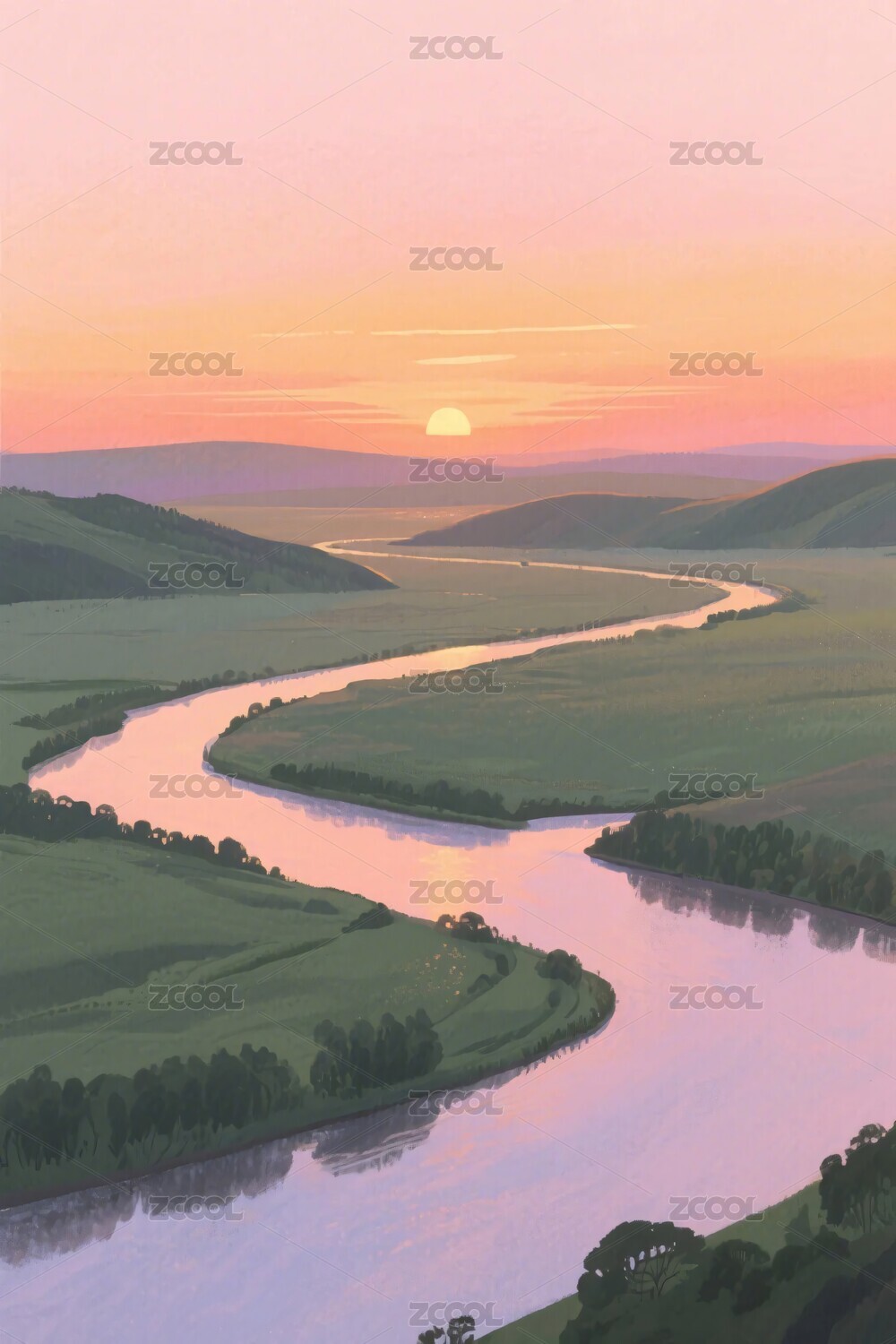 河流,山丘,夕阳,树林,风景,插画,自然,风景画,矢量,宁静