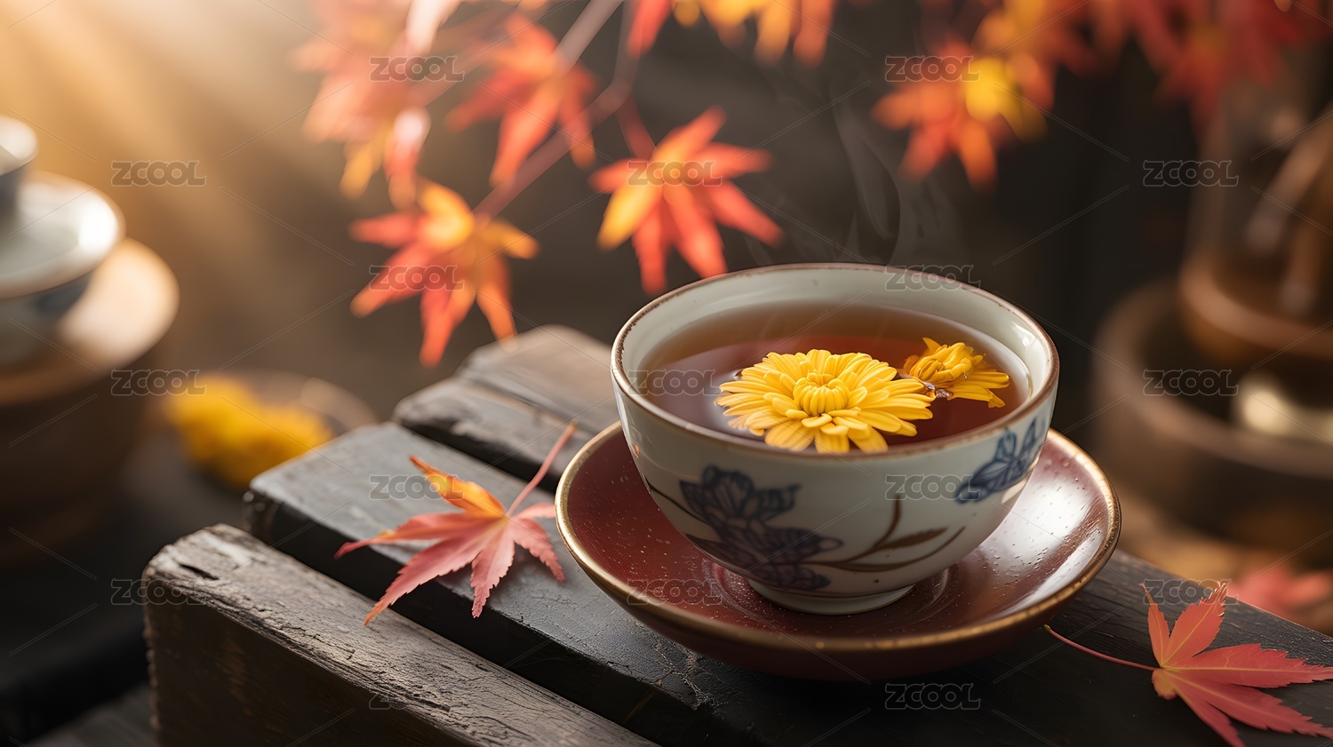 菊花茶杯秋叶相伴