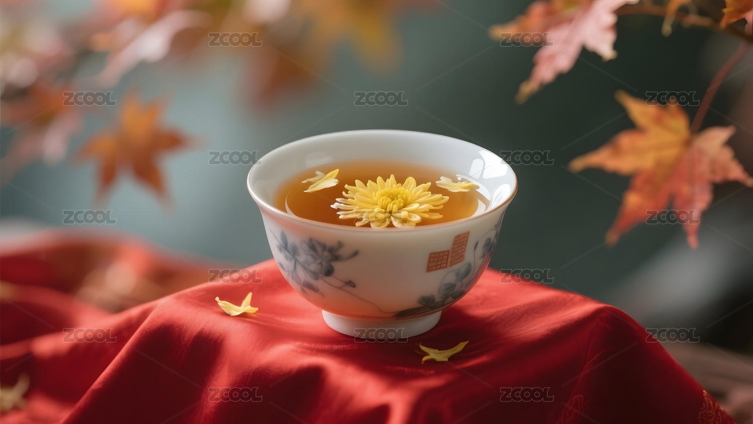 菊花茶杯红布秋叶