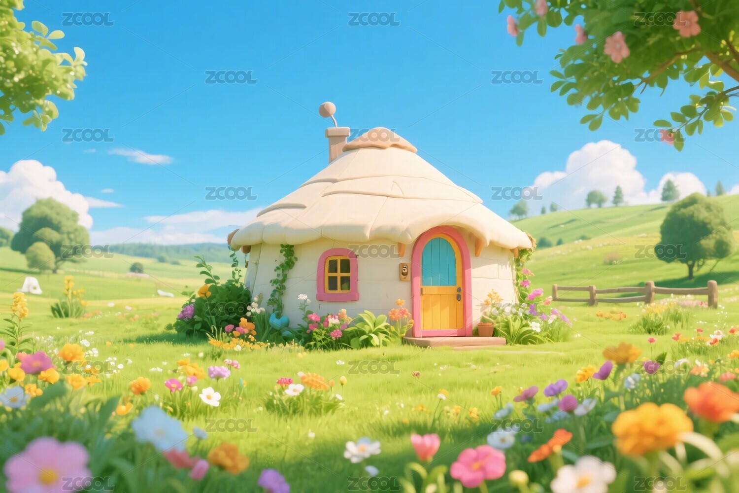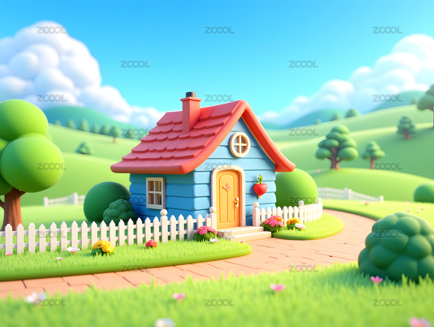 卡通房屋,乡村风景,田园风光,小屋,树木,草地,天空,白云,栅栏,花朵