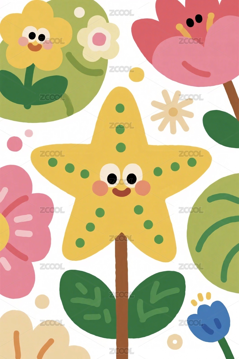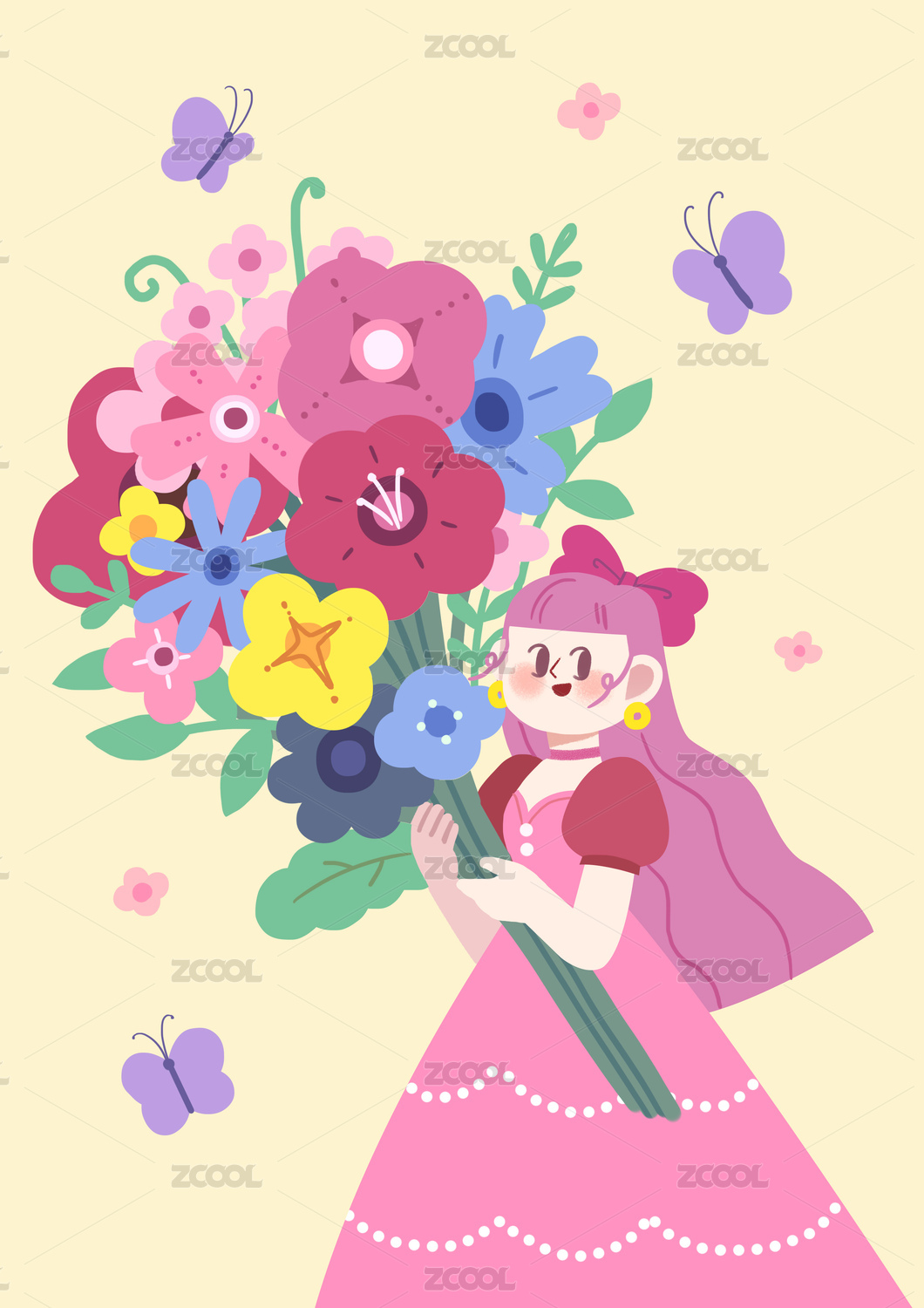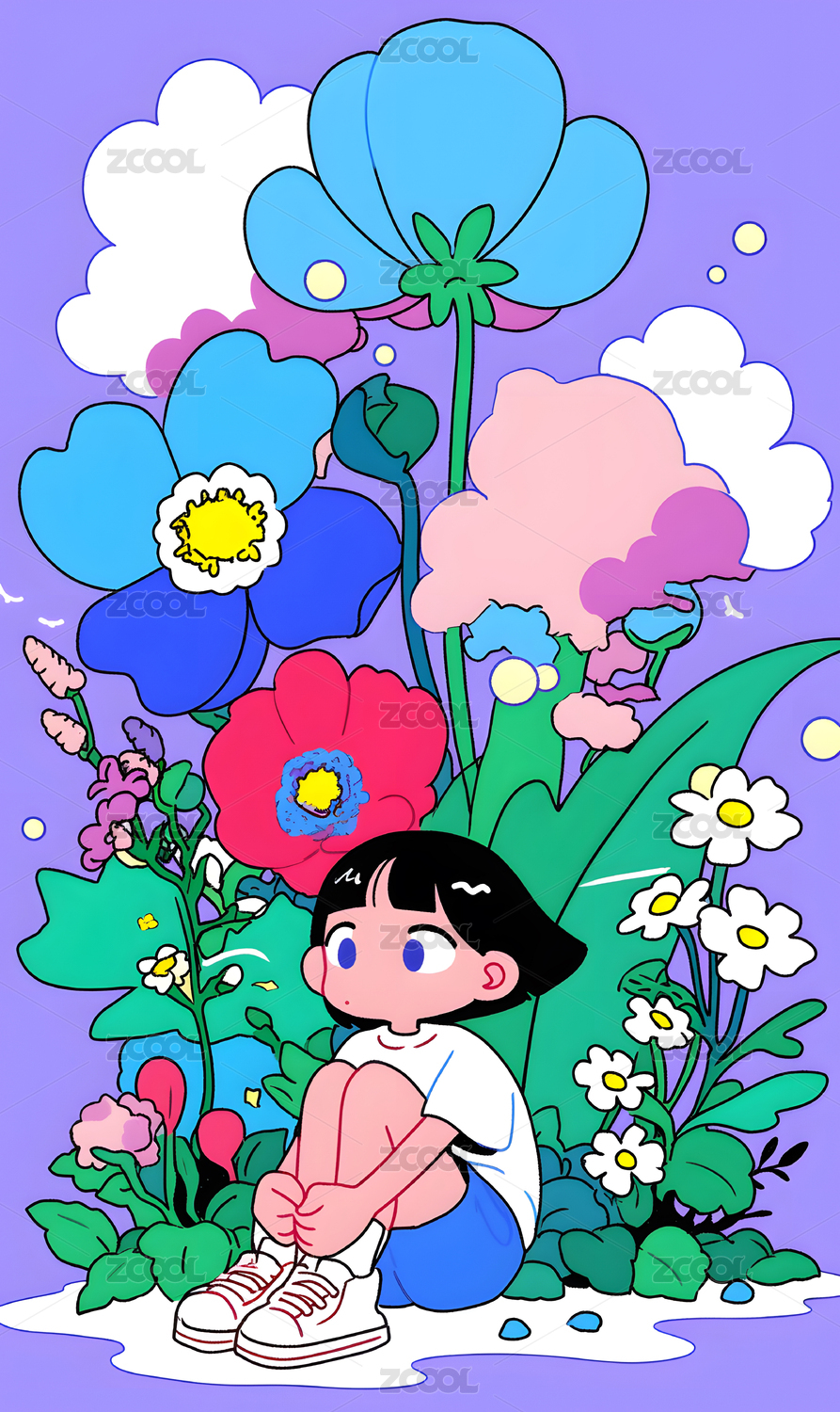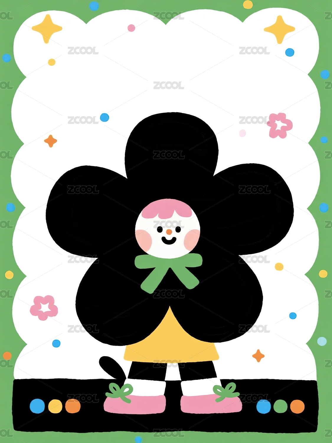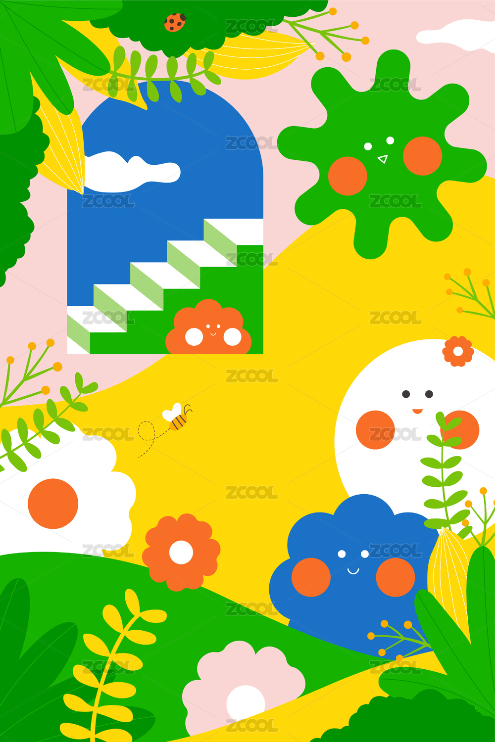 春天鲜花植物窗户小怪物可爱吉祥物插画