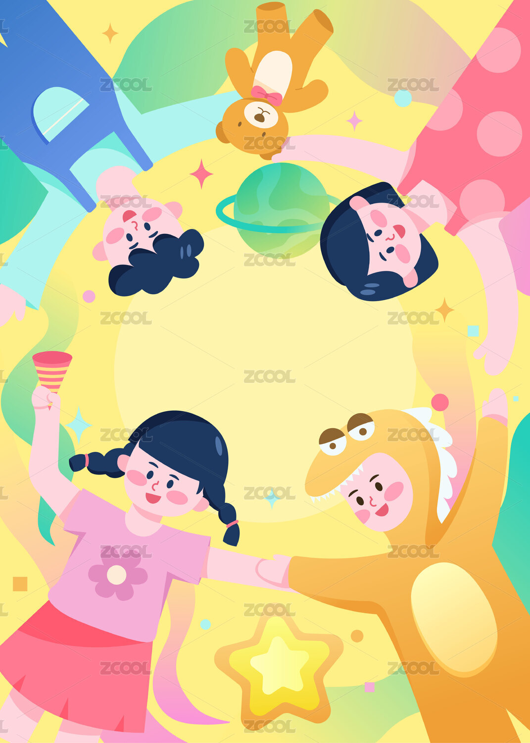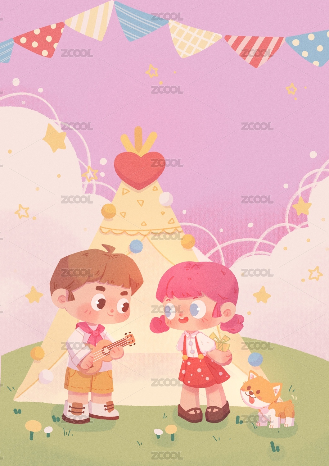 小女孩,小男孩,小鸟,心形花,爱心,彩带,花朵,插画,卡通,儿童