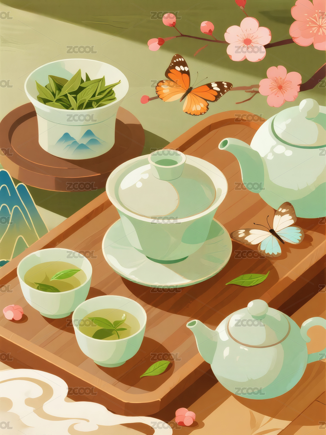 绿叶环绕的茶具与茶碗
