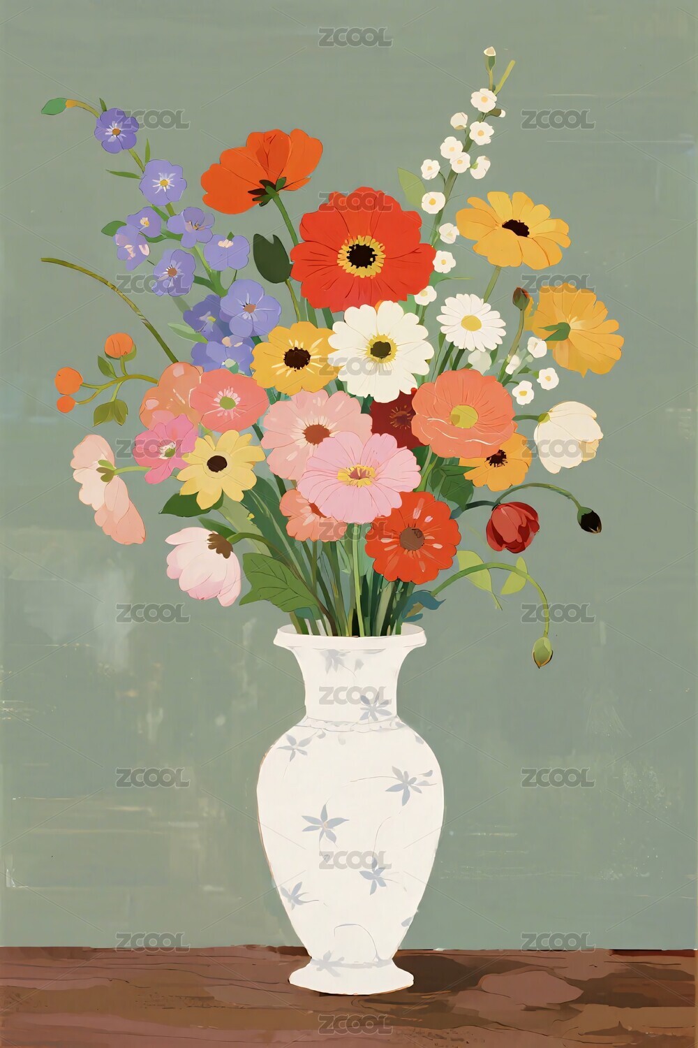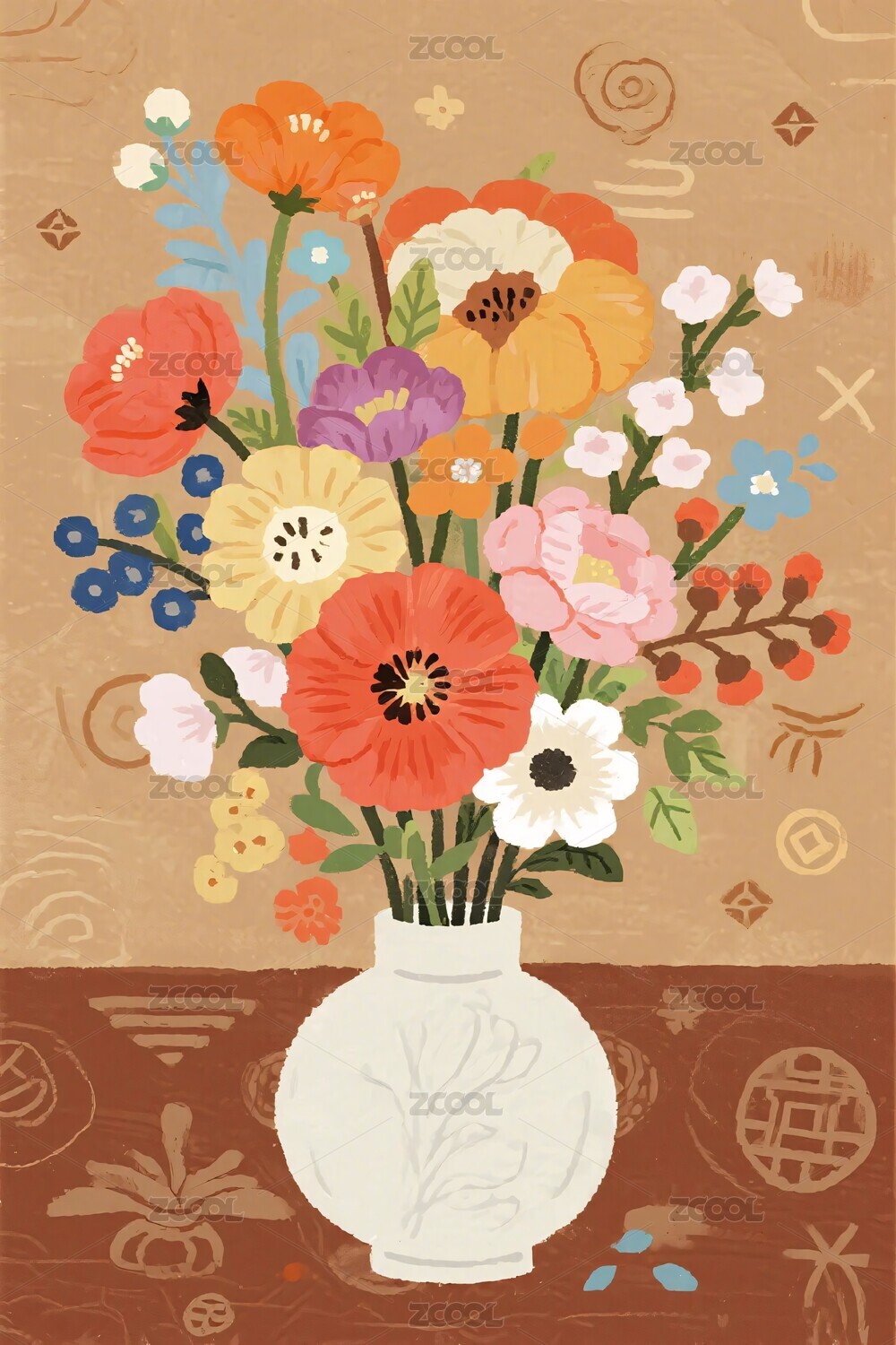 室内静物桌面花瓶装饰插画扁平风肌理竖幅