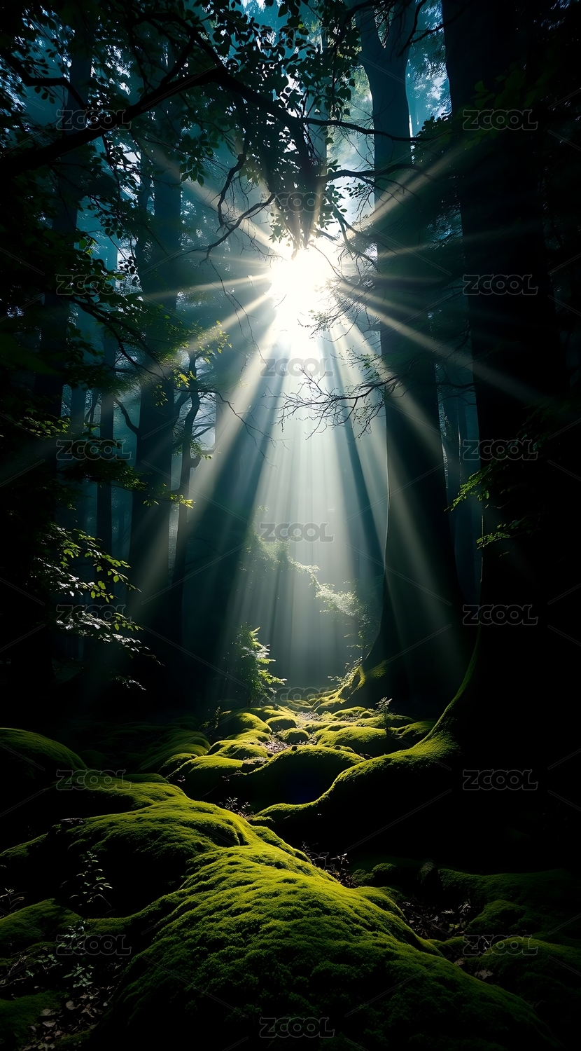 阳光穿透森林照耀着覆盖青苔的小溪和岩石