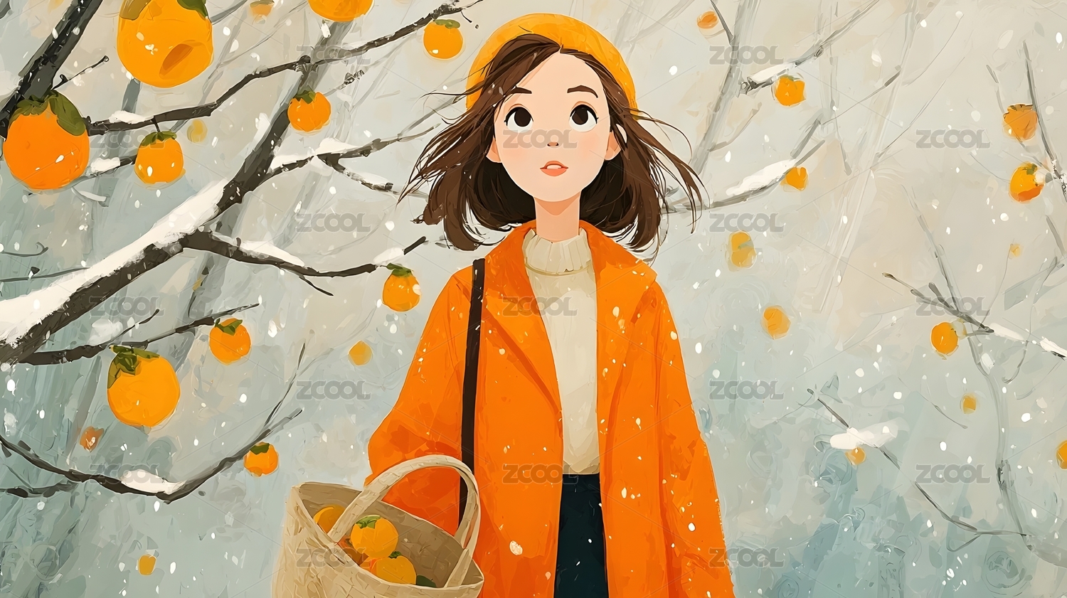 雪中摘柿子的少女