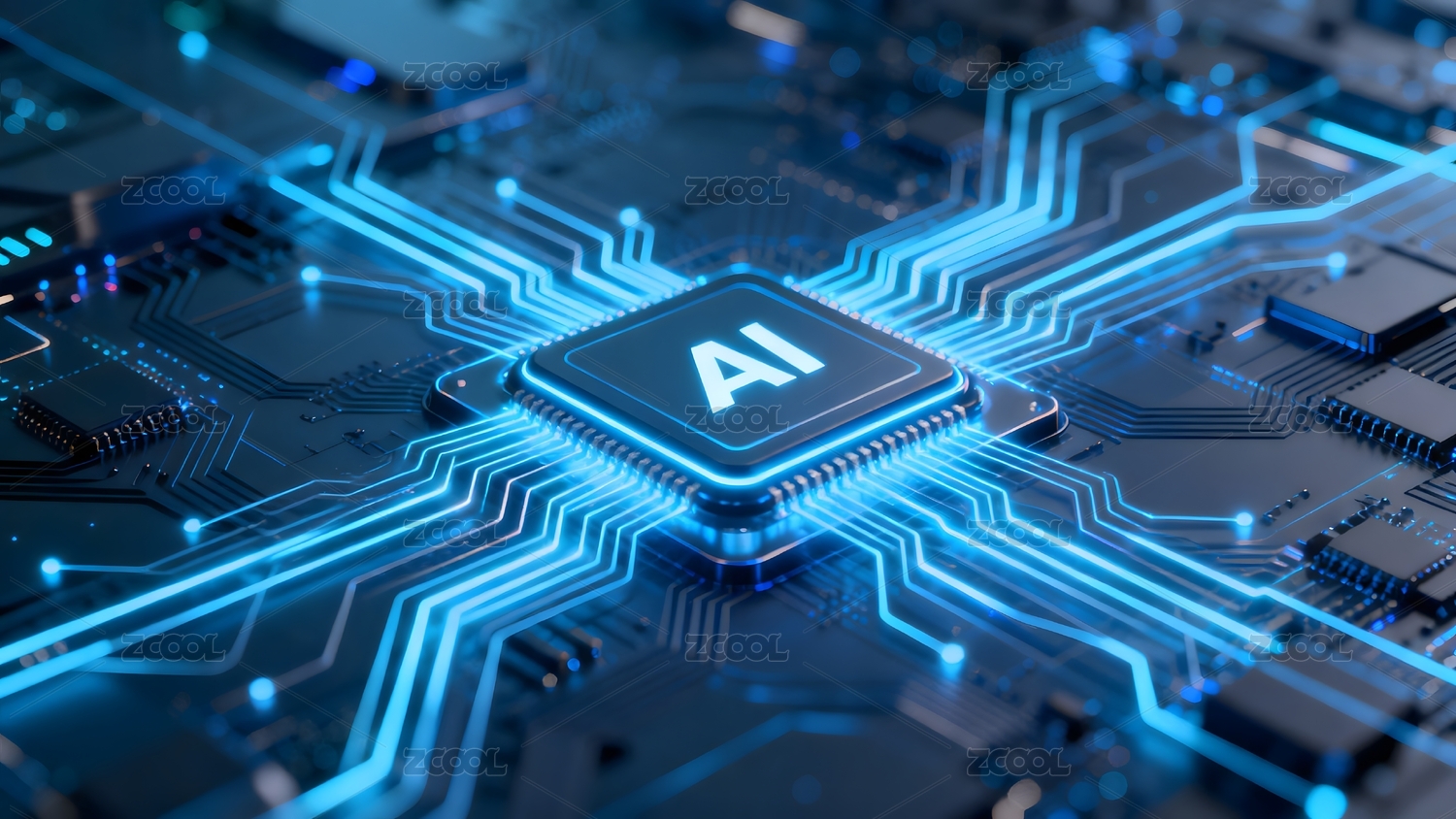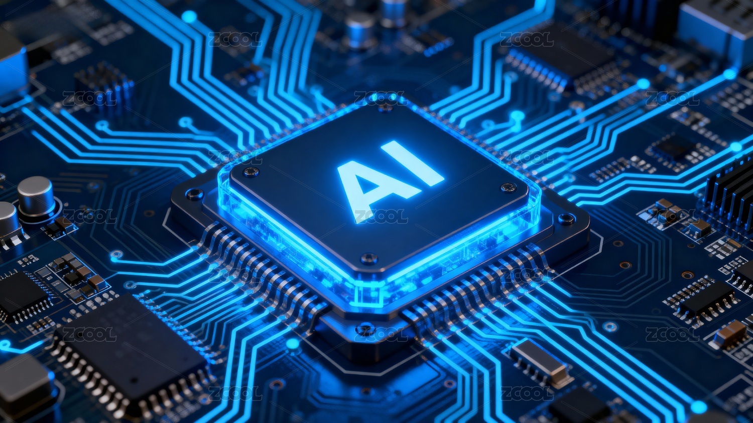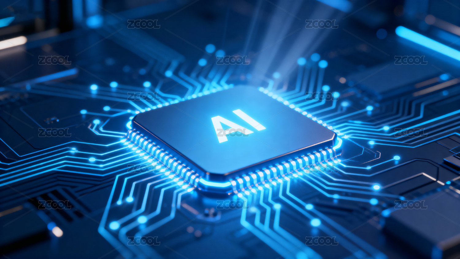 蓝色电路板上的AI芯片发光