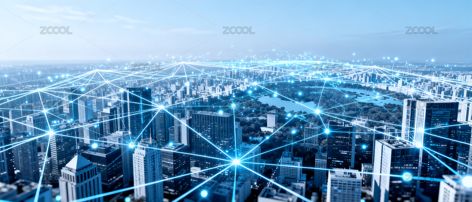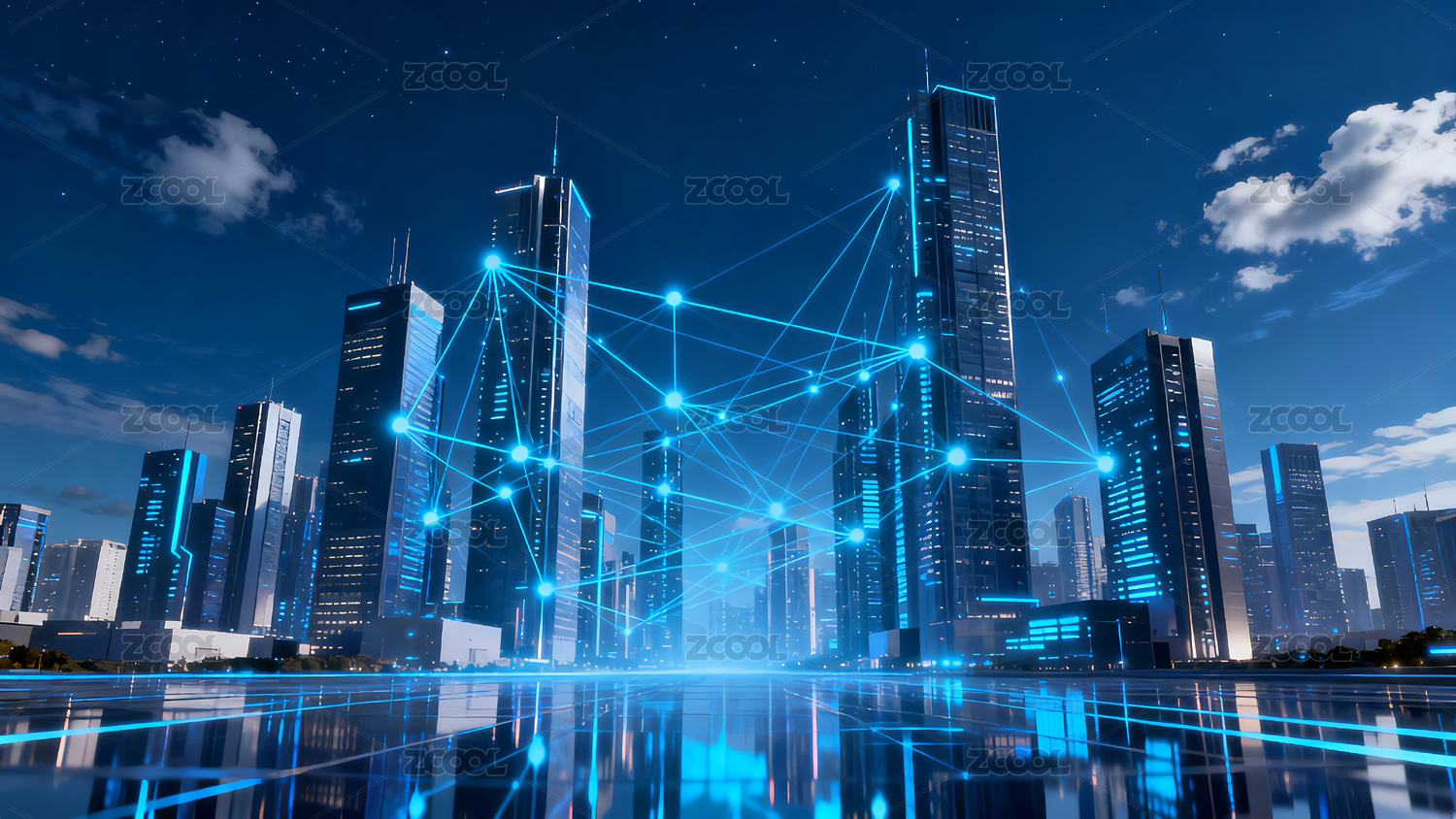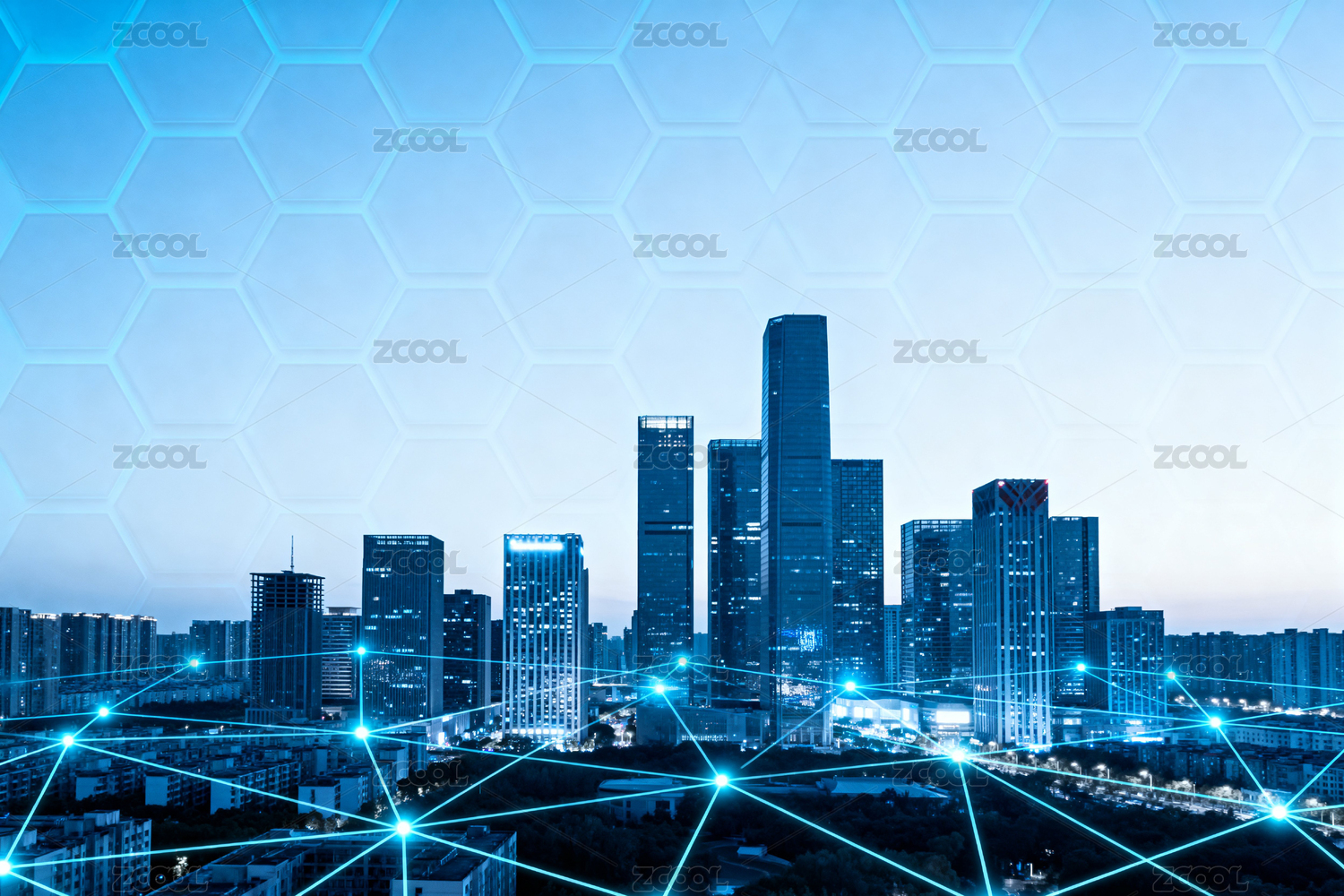 现代商业金融建筑仰视,5G互联网智慧城市高速发展,人工智能大数据概念视图