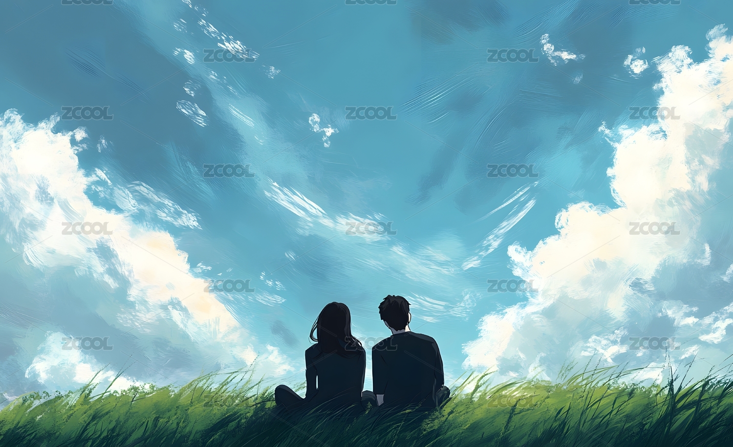 月亮星空下步行的青年情侣背影温馨梦幻手绘插画