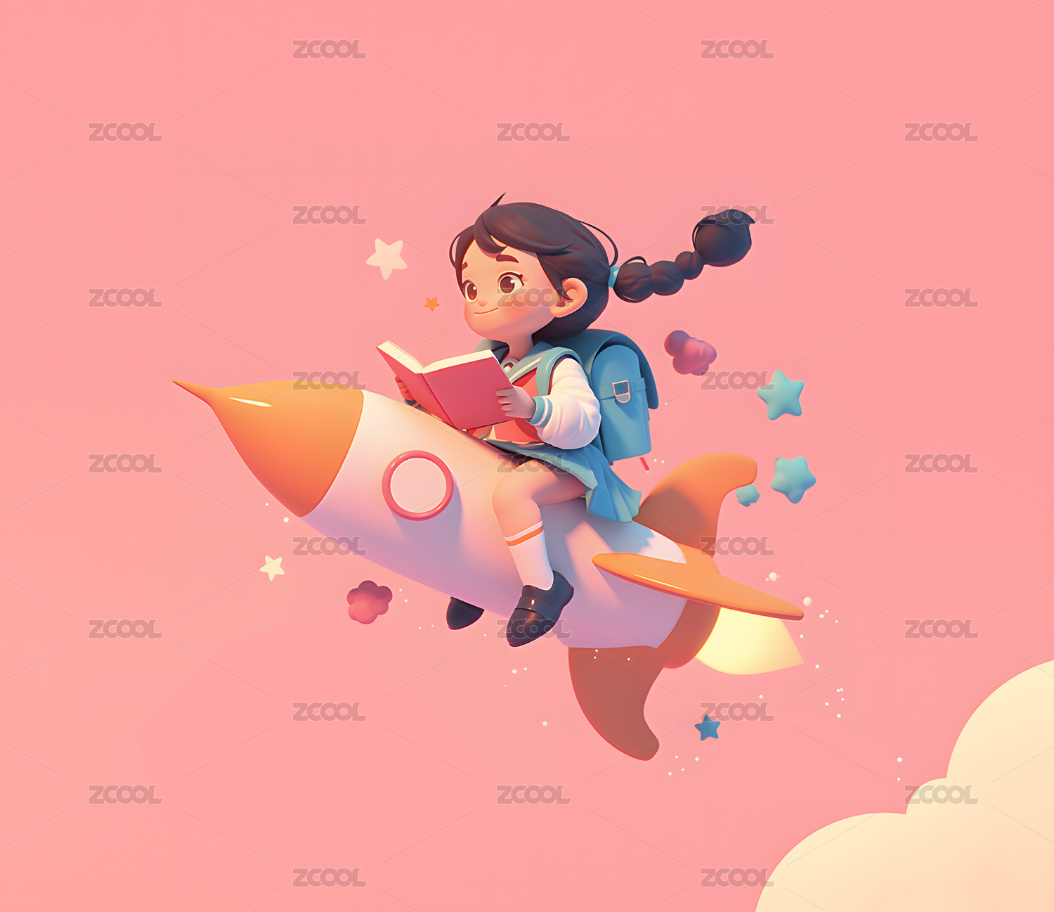 女孩,科技,书籍,火箭,阅读,飞行,黑发,红衣,短裤,运动鞋