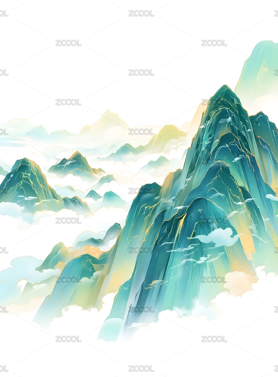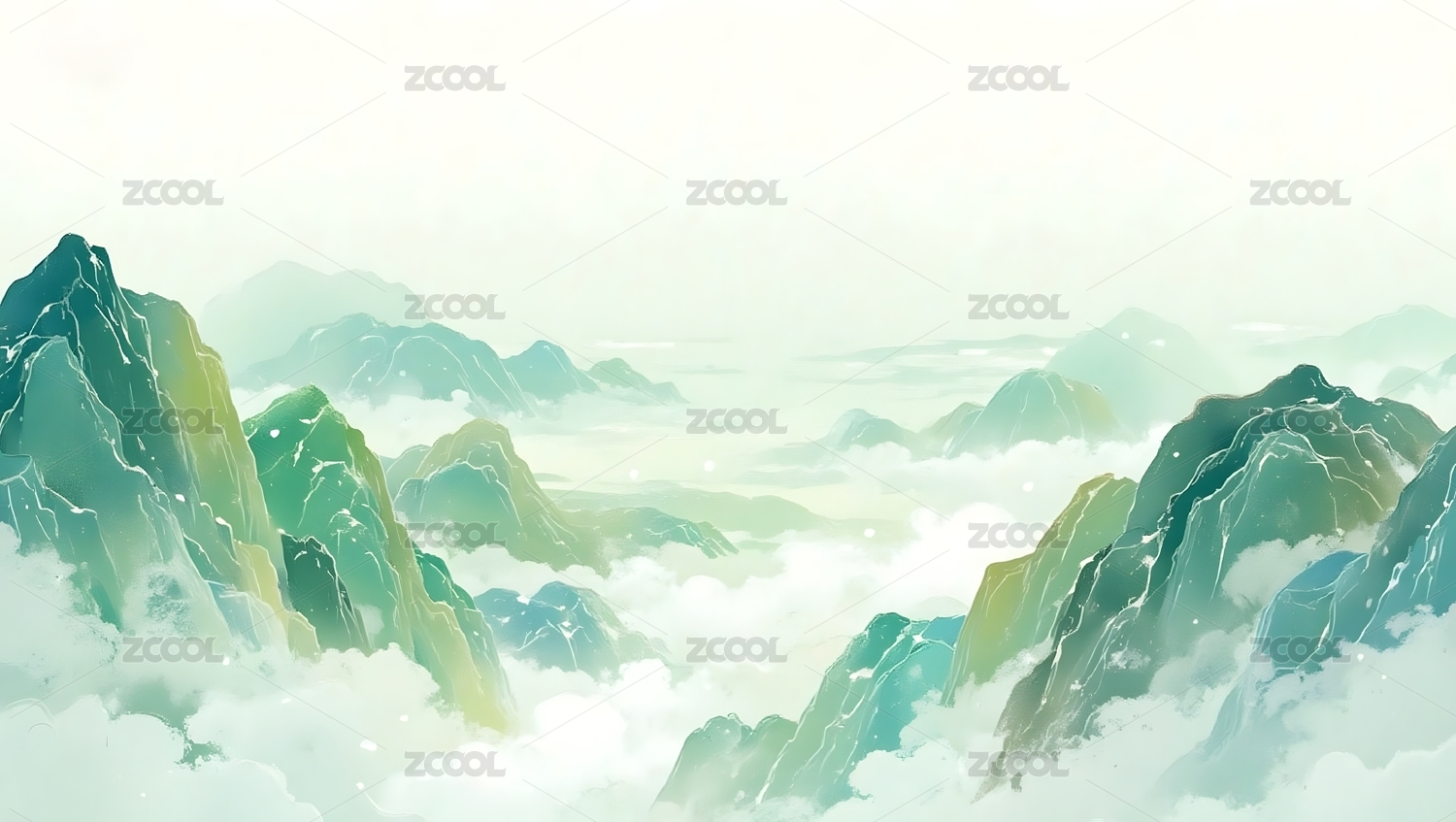 山,云,山脉,云海,水墨,绿色,山峰,云雾,绘画,自然
