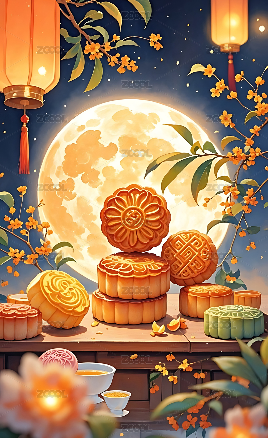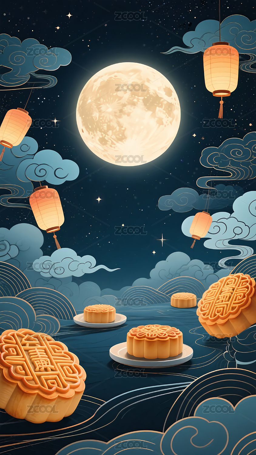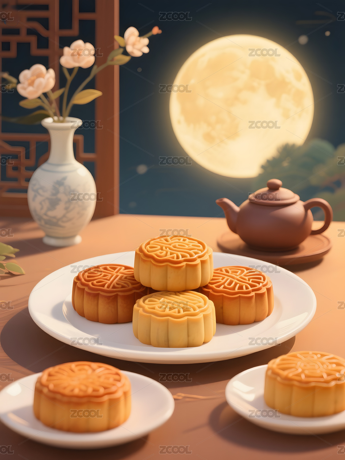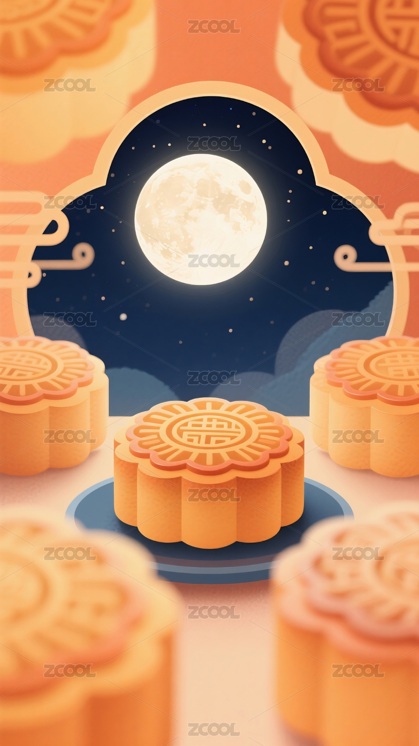 中秋月饼与满月场景图