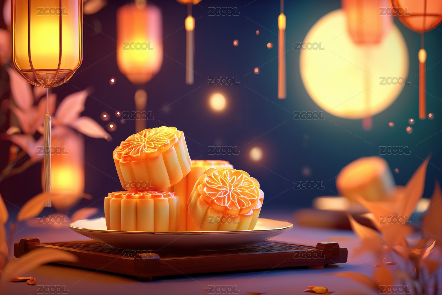 3D中秋节传统月饼灯笼背景