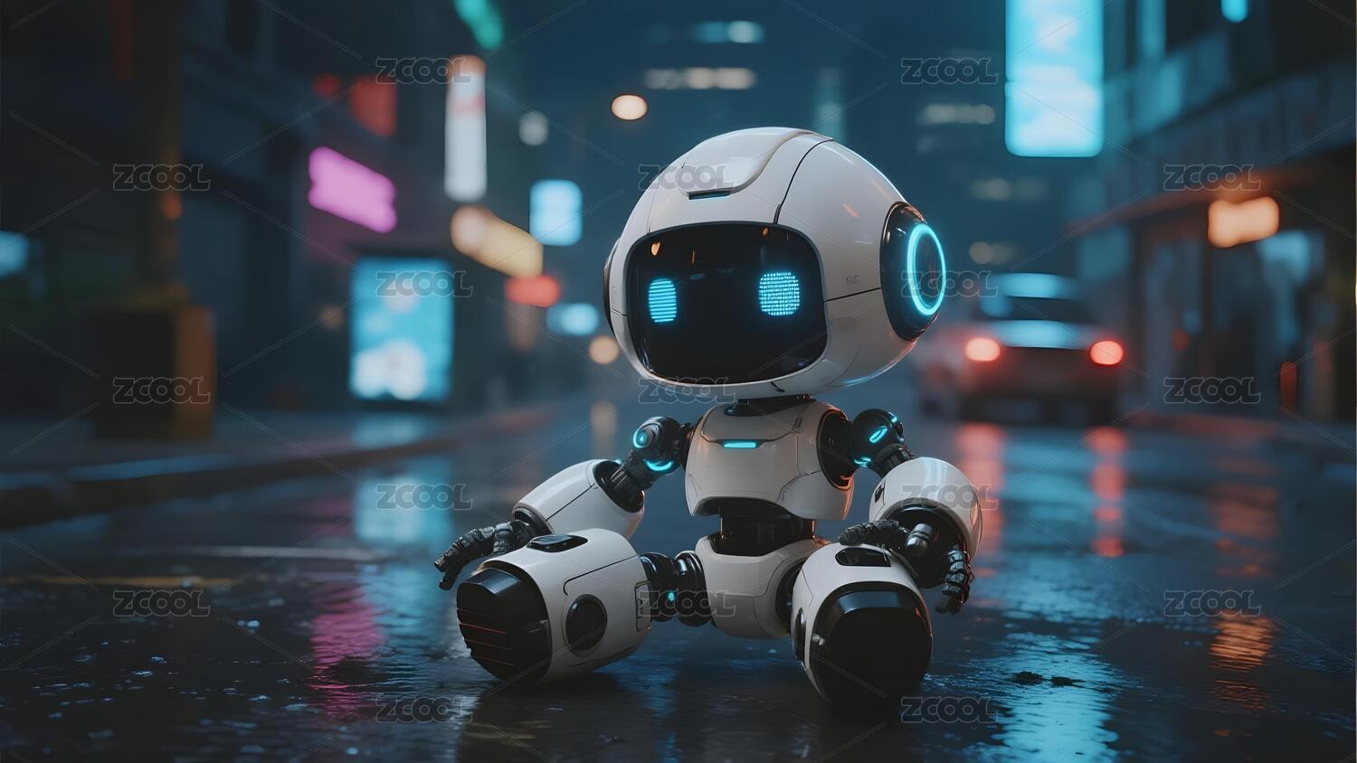 机器人坐在雨夜城市街道上