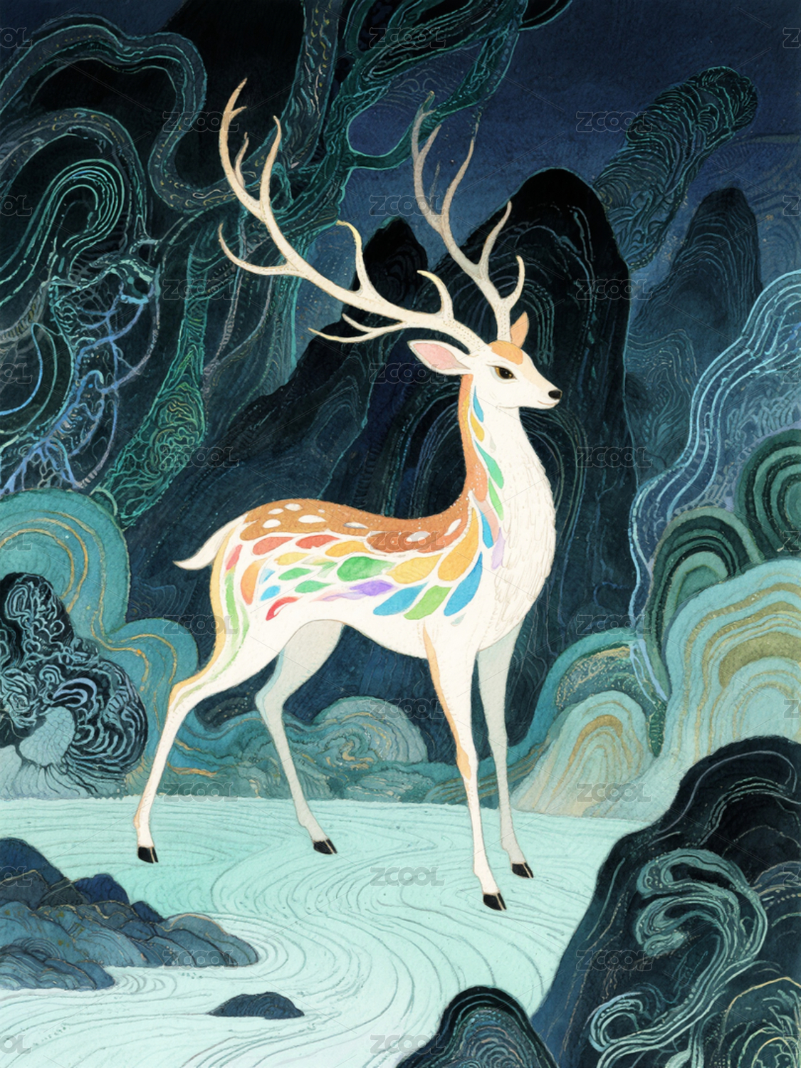 国风神话白鹿祥瑞插画艺术素材