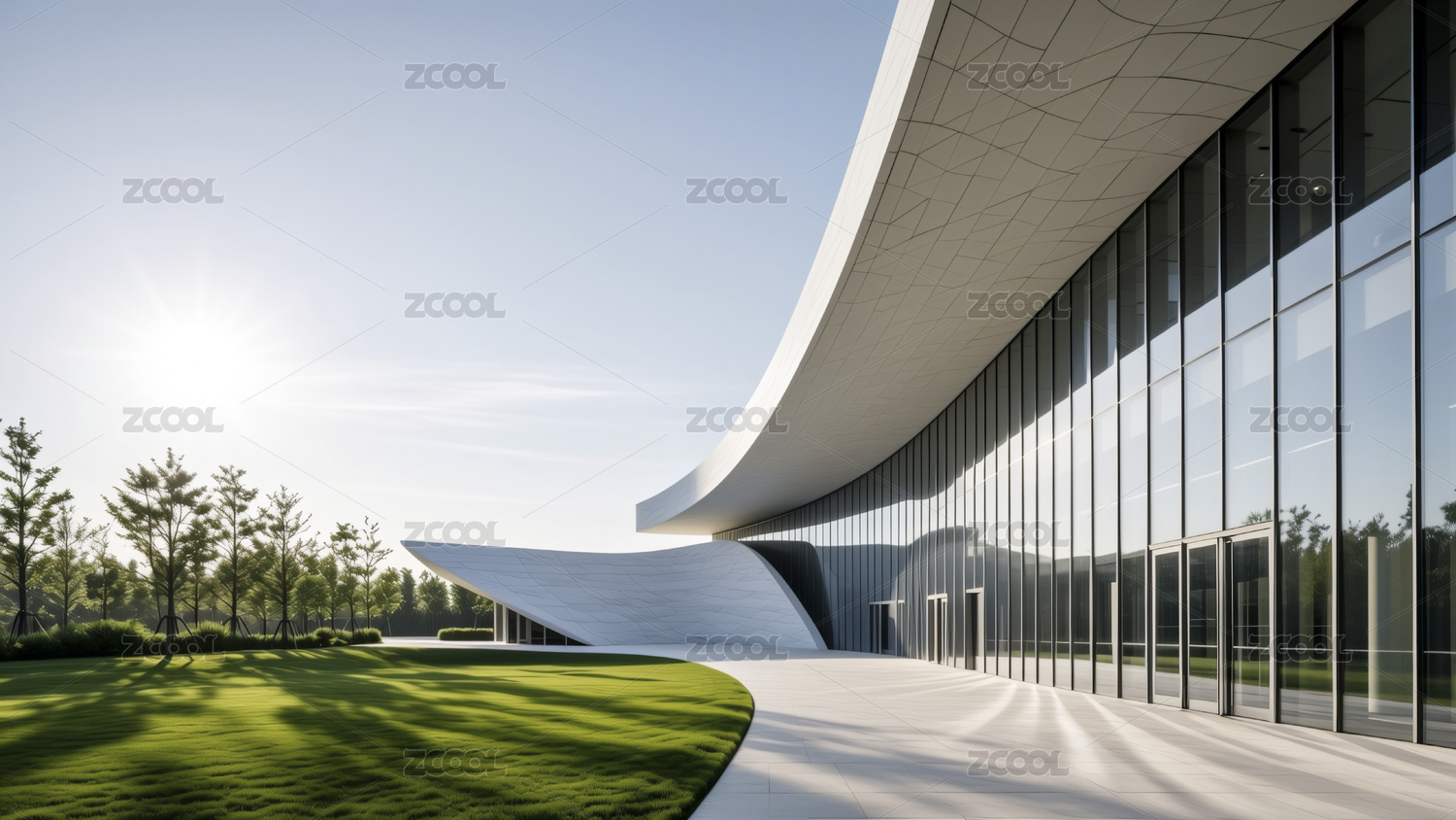 园林里巨大落地窗弯曲造型现代建筑外部空间