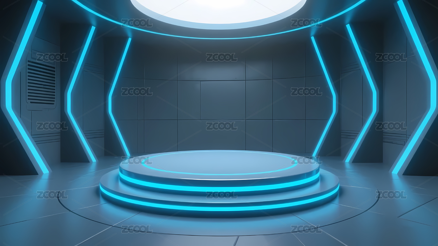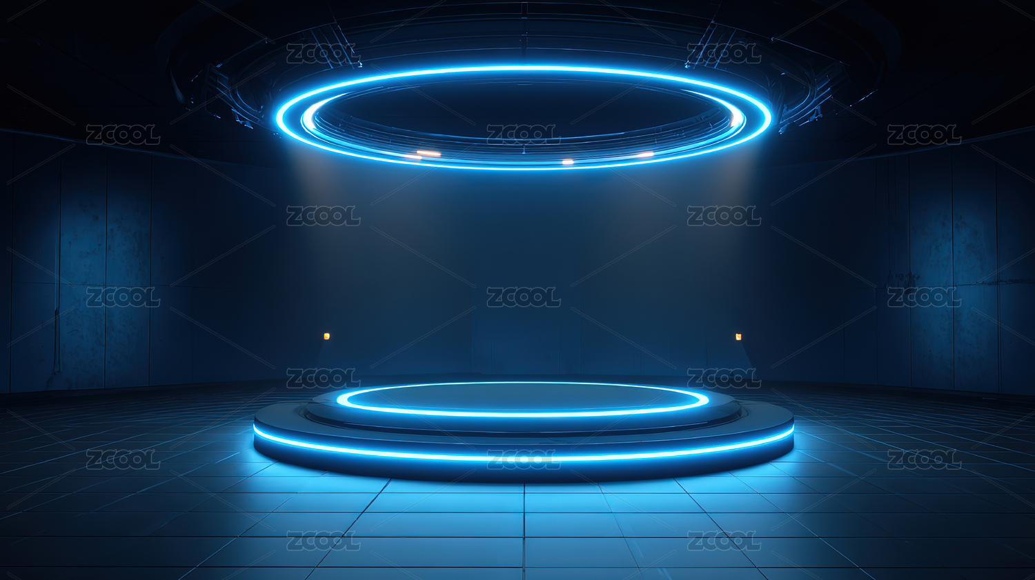 蓝色霓虹环绕圆形平台