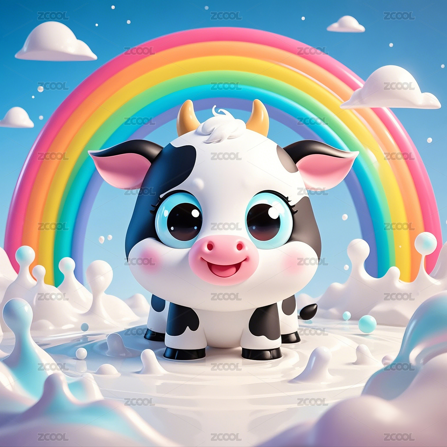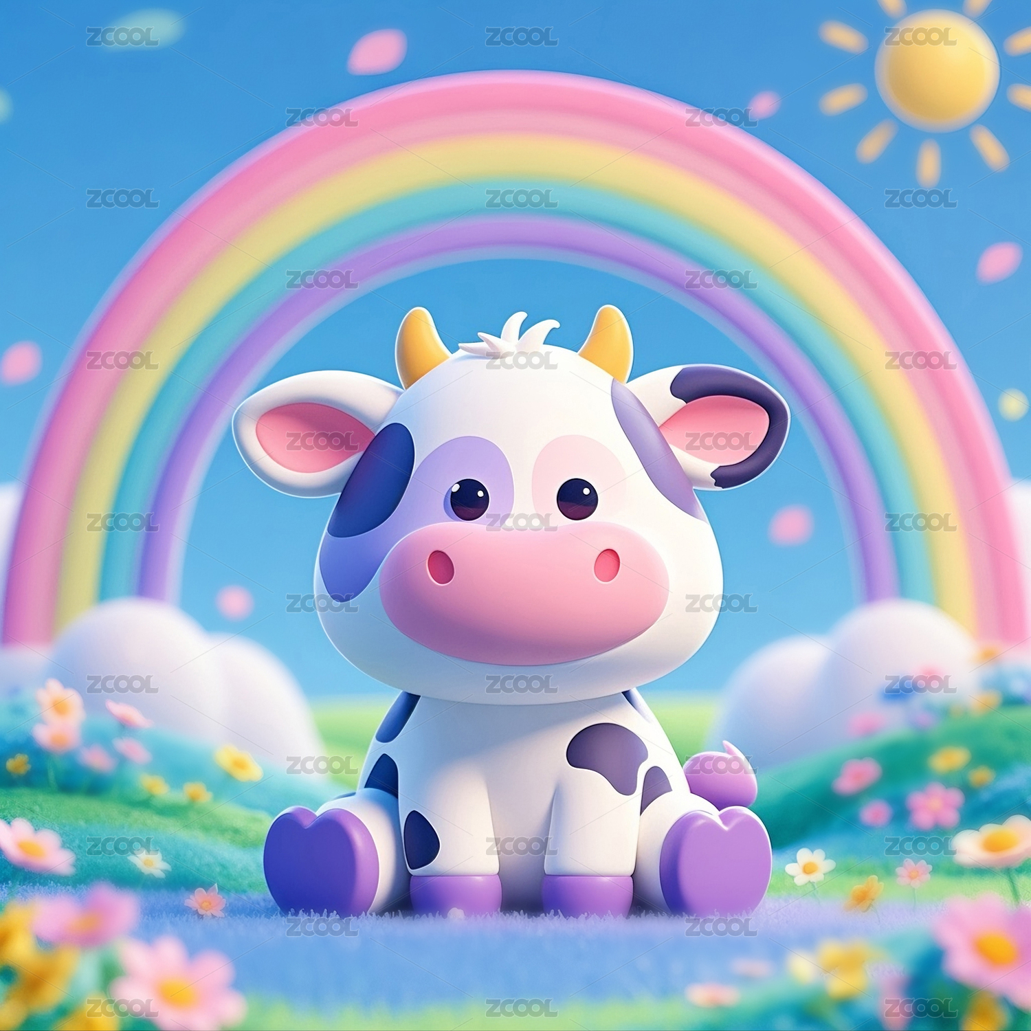 3D动漫风格的奶牛宝宝和彩虹