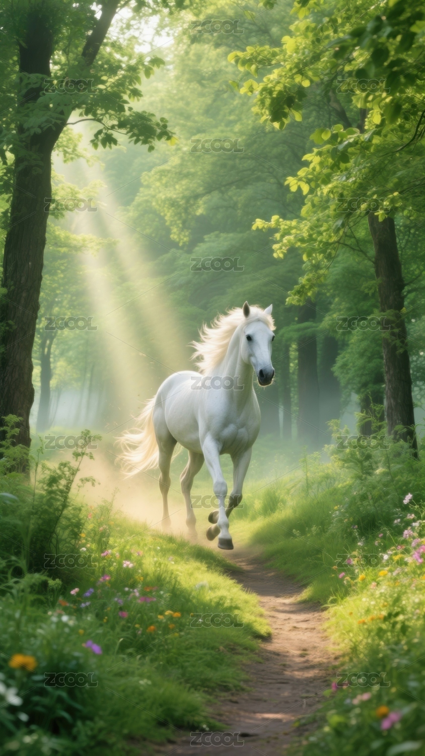 白马,奔跑,森林,小径,阳光,绿树,草地,花朵,光影,自然