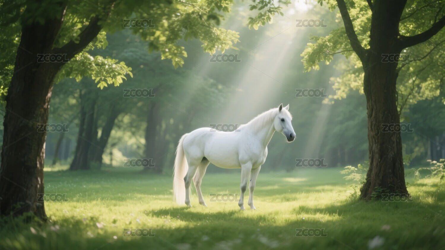 林间阳光下的白马