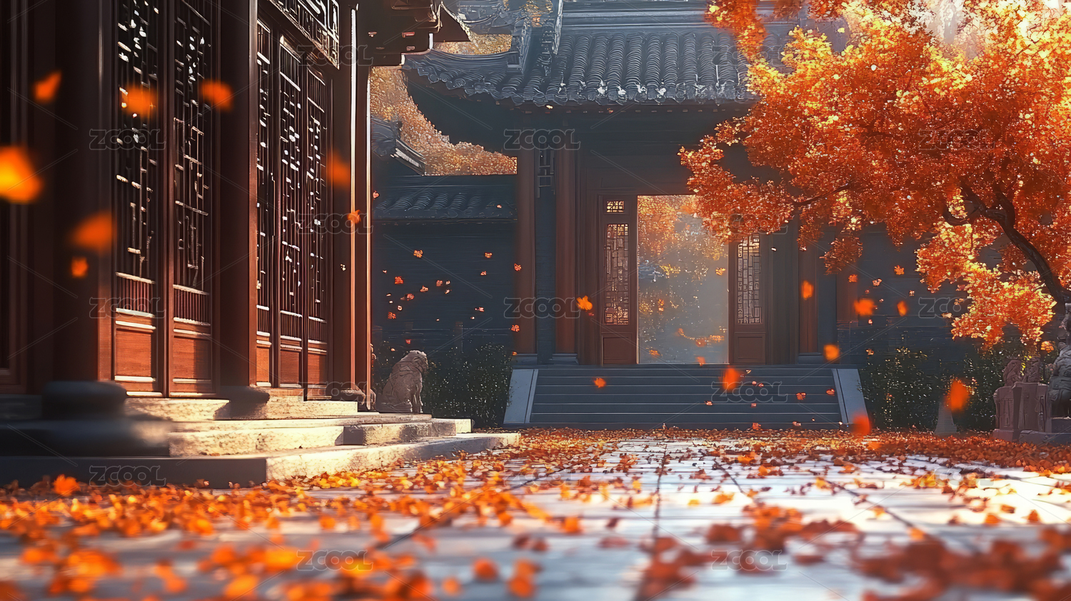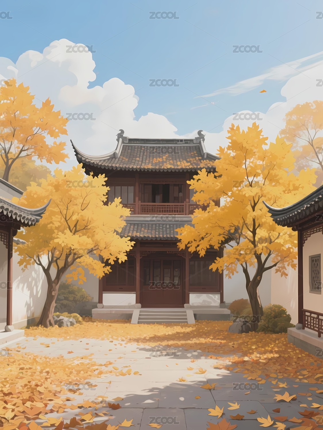 秋日庭院古建筑与金黄落叶
