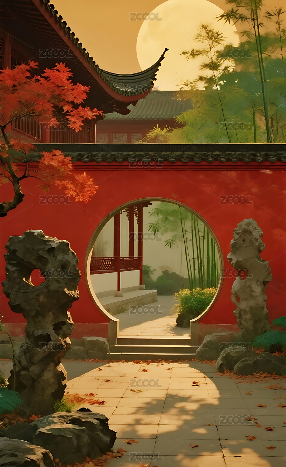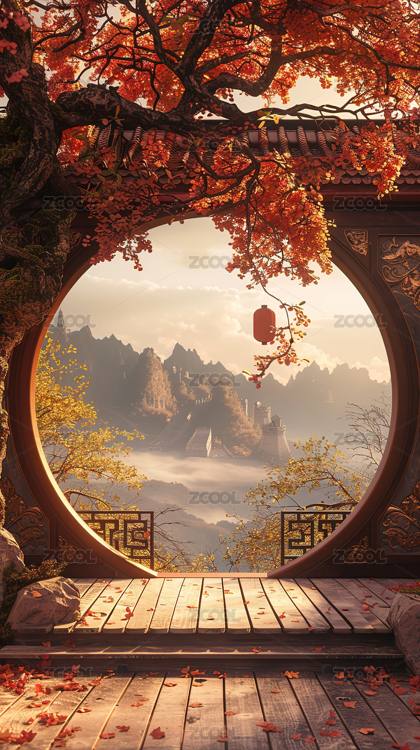 秋天古窗外的红枫和银杏