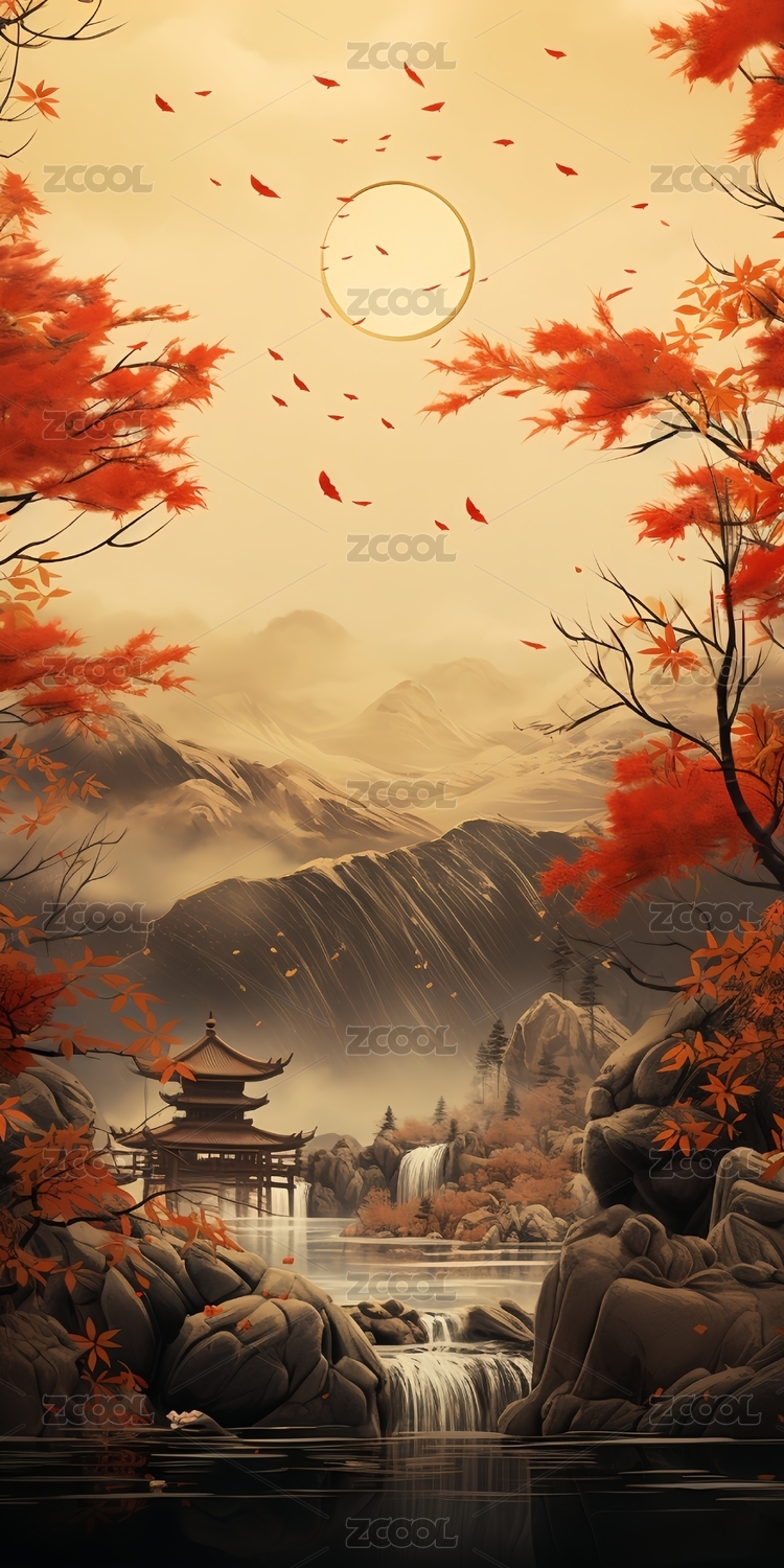古巷秋景水墨画