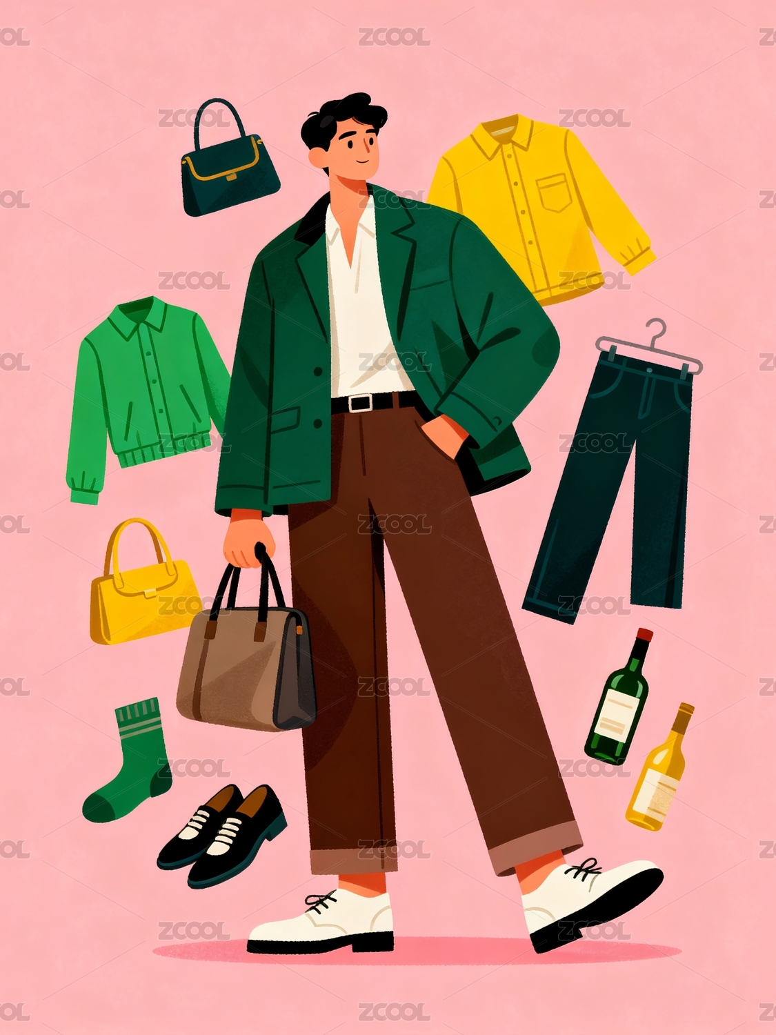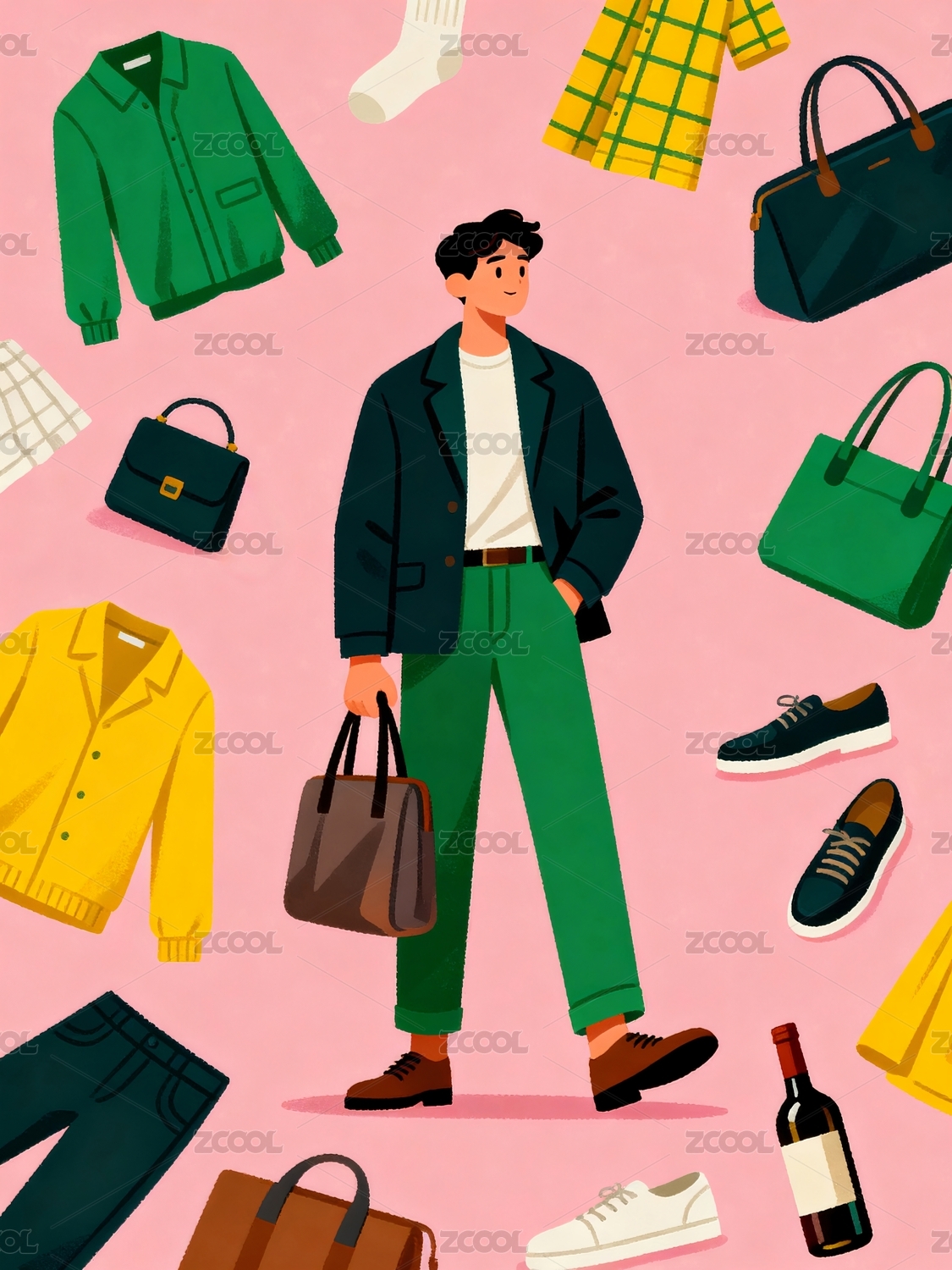 男士,外套,衬衫,长裤,鞋子,包包,墨镜,绿色,黄色,黑色
