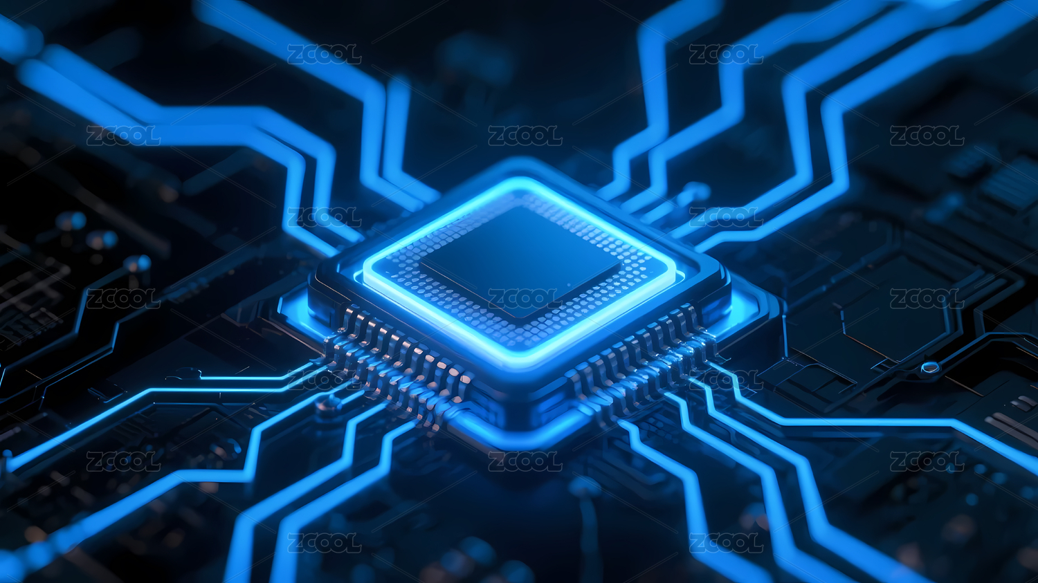 蓝色芯片与电路线条