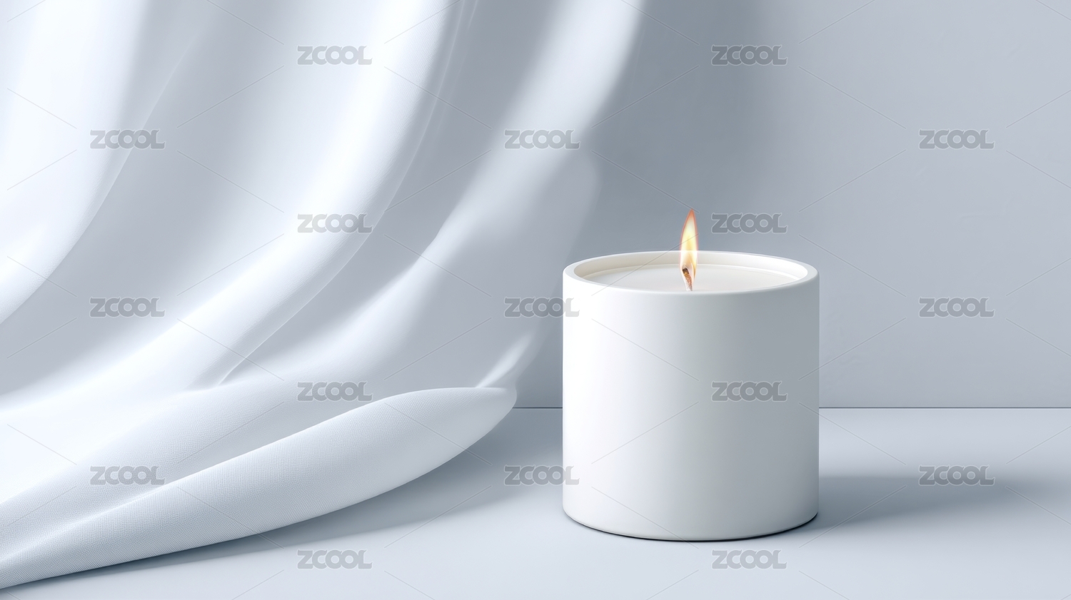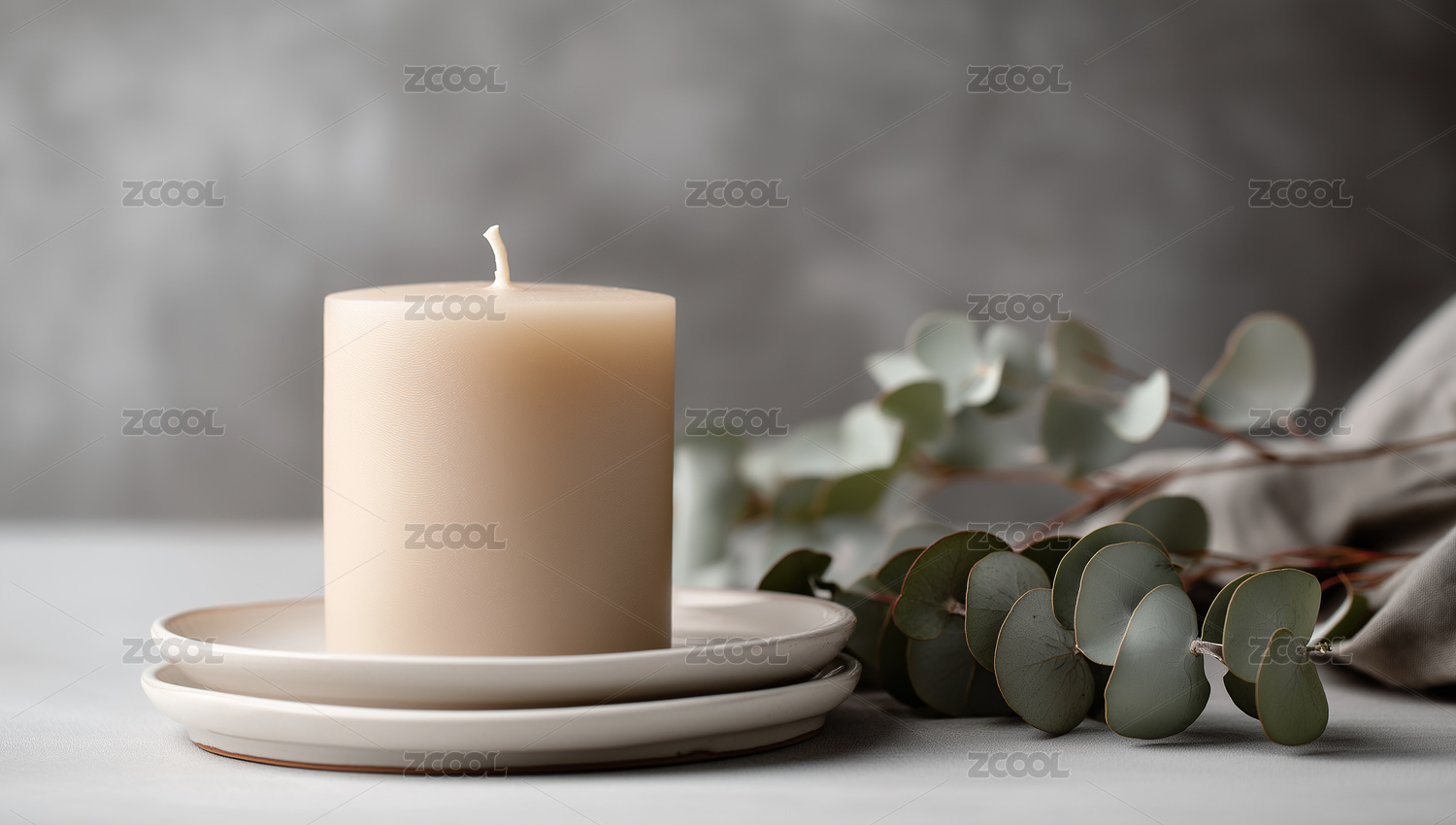 灰墙前蜡烛尤加利叶与织物的静物组合