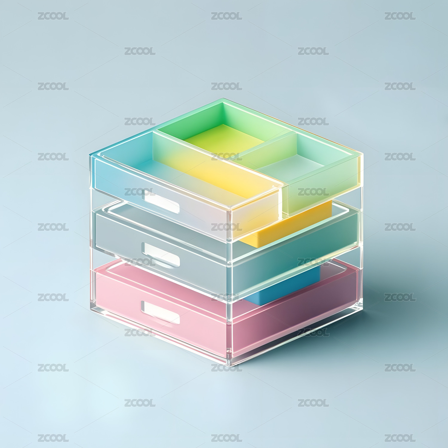 绿蓝透明抽屉柜与彩色方块