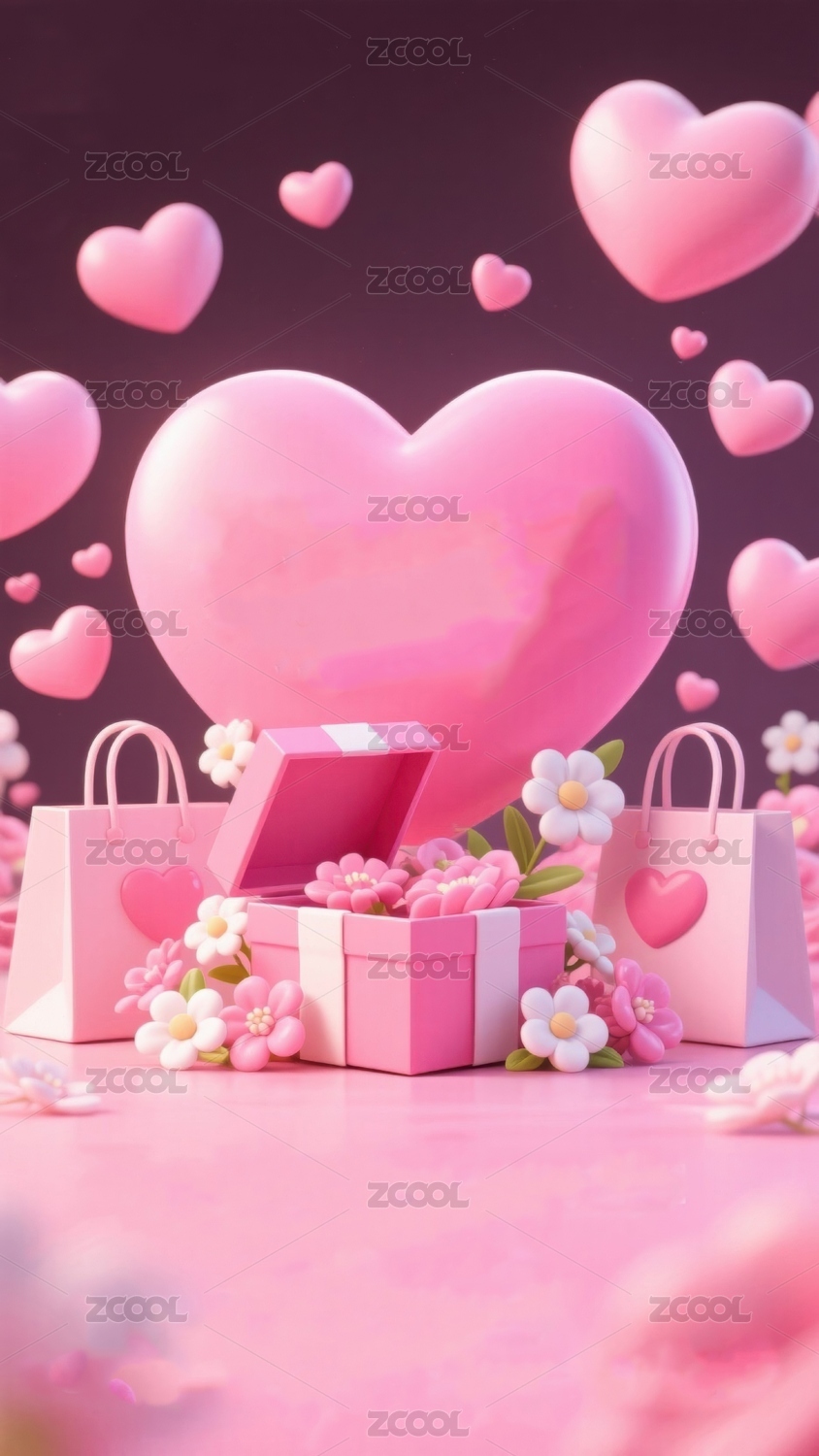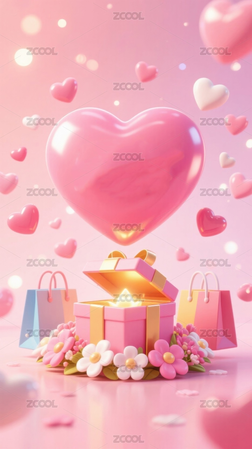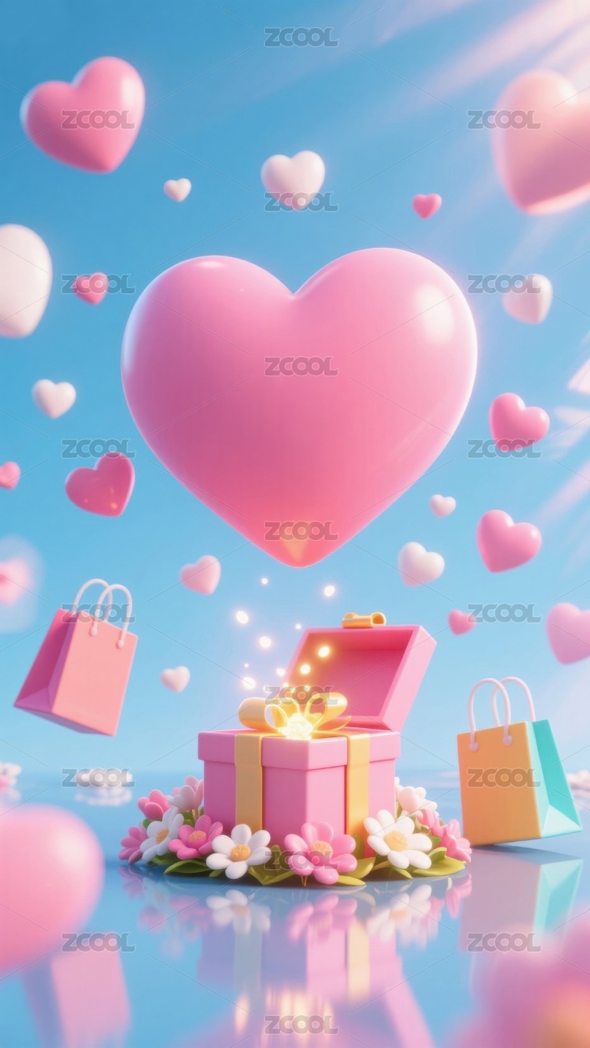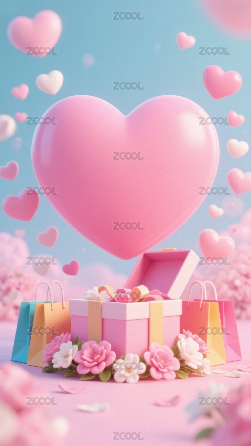 粉色爱心与礼物盒的梦幻场景